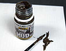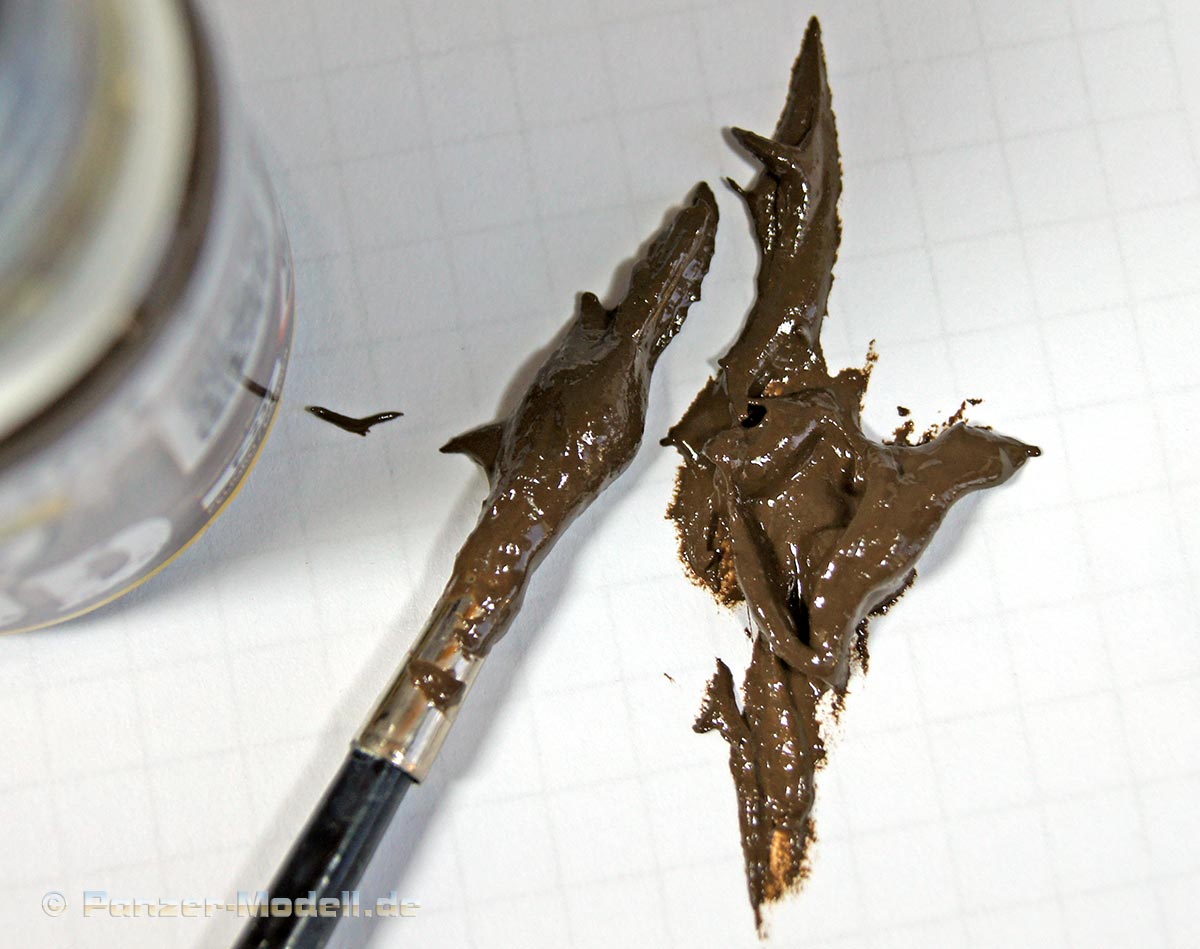 Unter dem Namen Heavy Earth verbirgt sich ein bereits fertiges Produkt um Matsch, Schmutz darzustellen. Die Übersetzung würde ich als feuchten, festen Boden/Matsch umschreiben. Die Konsistenz kommt von Farbe und Aussehen einer bekannten Nuss-Nougat Frühstückscreme sehr nahe. Der Matsch kann je nach bedarf weiter verdünnt werden mit Verdünnern auf Emailebasis. Mit dem Verdünner lassen sich auch Pinsel, Werkzeuge etc. reinigen. Der Anwender erhält hier ein Produkt um Matsch im Gelände, am Fahrzeug usw. darzustellen. Ein vielseitiges Produkt das dem Modellbauer ein fertiges Produkt an die Hand gibt die sich in Farbe und Form variieren lässt.