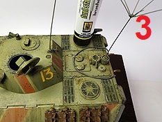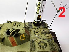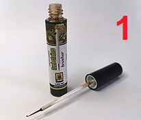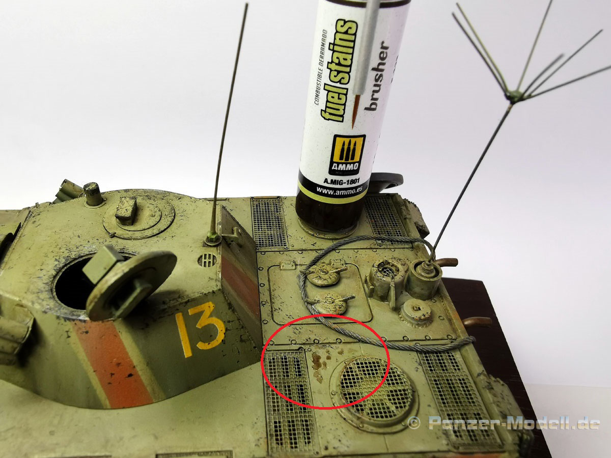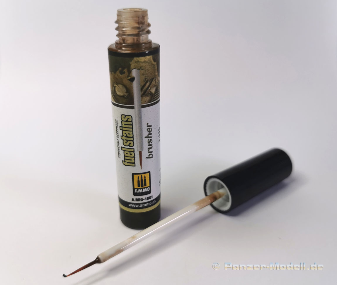 Diese Brusher auf Acryl Basis sollen dazu dienen Alterungs-, Witterungs- und / oder Verschmutzungseffekte am Modell realistisch dazustellen. Dieser spezielle Brusher soll zur Darstellung von Ölflecken auf der Modelloberfläche dienen. Der Fuel Stains Brusher, besteht aus einem schmalen Kunststoffbehälter mit 10ml Inhalt. An der Verschlusskappe befindet sich ein feiner Pinsel mit langem Stiel. Die Anwendung ist denkbar einfach: Nach kurzem Schütteln des Behälters öffnet man die Verschlusskappe, entnimmt mit dem an der Kappe befindlichen Pinsel etwas von der Flüssigkeit und bringte diese an der gewünschten Stelle am Modell auf. Direkt aus dem Behälte entnommen wirkt der Farbton für mich persönlich etwas zu dunkel. Siehe Bild 2. Man kann den Fleck aber noch weiter bearbeiten damit er noch etwas subtiler wirkt und nicht allzu dunkel und kräftig wirkt. Dazu nimmt man einen Pinsel, befeuchtet diesen mit etwas Wasser oder mit dem Acrylic Thinner Amig-2000, und kann anschließend den Fleck wunschgemäß verändern um etwas mehr Realismus zu erreichen. Bei der Verwendung von Wasser empfehle ich destilliertes Wasser zu nehmen, wegen der geringeren Oberflächenspannung. Siehe Bild 3. Und nun zum Fazit: Geringe Geruchsbelastung, Farbton etwas zu kräftig getroffen, einfache Anwendung, formschöne Verpackung, einfache Handhabung. Was will man mehr? Ich finde diese Effects Brusher auf Acryl-Basis wirklich klasse. Wir bedanken uns bei Mig Jimenez, Ammo by Mig, für das Muster. Special thanks to Ammo by Mig for the sample.