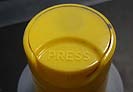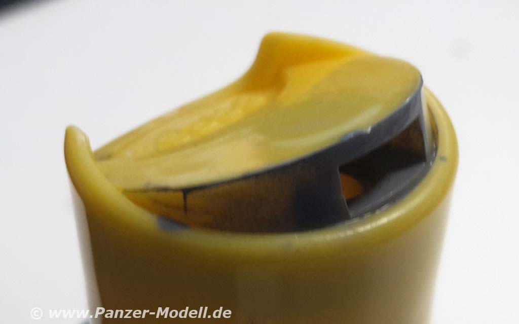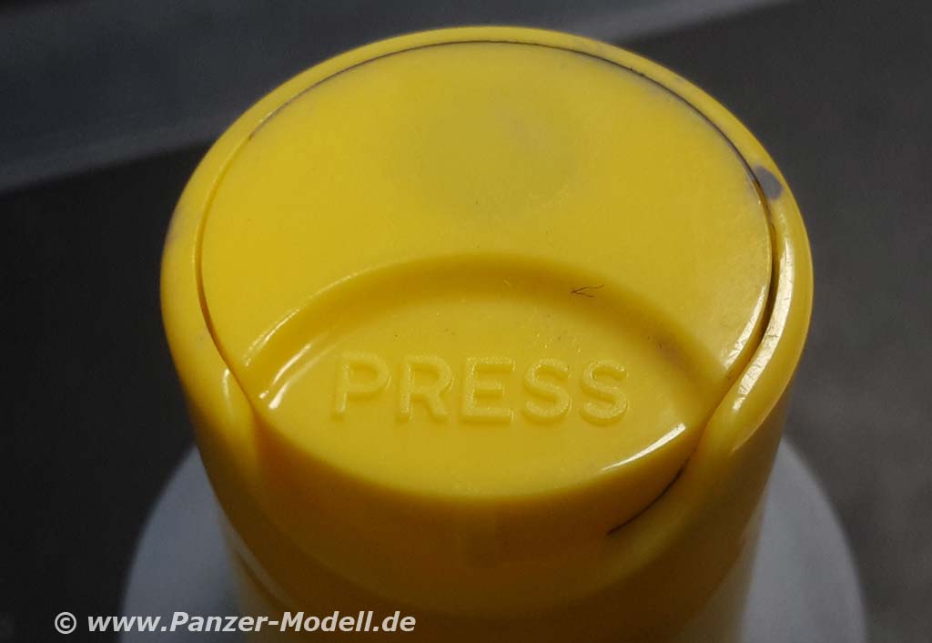 Der gelbe Deckel enthält einen Kipp-Druckverschluss, der eine recht große Öffnung für die Farbe bietet. Damit kann man schnell größere Mengen Farbe aus der Flasche bekommen - kleinere Tropfmengen gestalten sich schwierig und die Farbe läuft auch schnell in die umliegenden Deckelbereiche und verschmutzt diese.