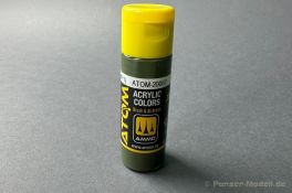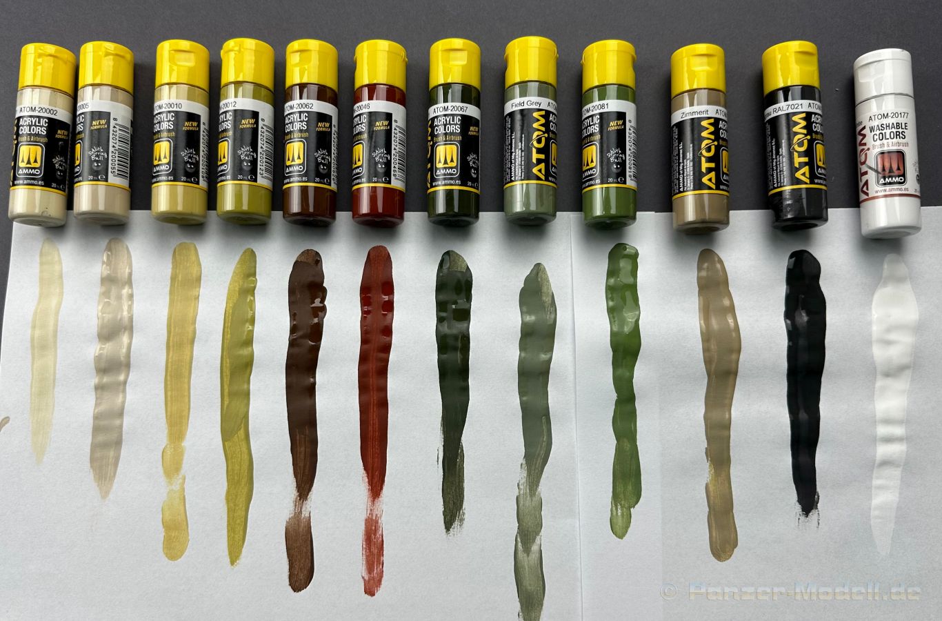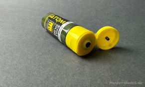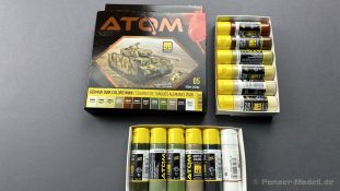 German Tank Colors WW2 Set Wie der geneigte Modellbauer weiß, haben Acrylfarben nicht nur Vorteile in Form von: - Geruchsneutral Sondern auch leider, haben die Wasserbasierten Farben Nachteile, als da wären: - Geringe Deckkraft Ammo of Mig möchte mit den Atomfarben genau diese negativen Eigenschaften ausmerzen. Ich habe die Farben für euch daher getestet. Doch zuerst die Eckdaten der neuen Farbreihe bzw. des neuen Farbsystems. Wir haben neue glasklare Plastiktropfenflaschen mit einem Inhalt von 20 ml, es ist wieder eine Stahlkugel enthalten, die ein besseres oder einfacheres Mischen ermöglichen soll. Es werden insgesamt 180 verschiedene Farbtöne angeboten. Ich empfehle jedoch DRINGEND die Farben ausgiebeig zu schütteln, am besten maschinell. Bei diesen 180 Farben sind, abwaschbare Farben und Metallictöne enthalten auch einen Thinner / Cleaner wird es passend zur Farbreihe geben. Der Hersteller gibt an, dass die Farben bei ca. 1-1.2 bar verarbeitet werden sollten, nicht verdünnt werden müssen und nach wenigen Stunden überstreichbar sein sollen, ebenso muss keine Grundierung verwendet werden. Mein Test hat ergeben, dass die Farben die sowohl für den Pinsel als auch mit der Airbrush verwendet werden können leider doch verdünnt werden müssen, besser gesagt die sehr stark pigmentiert sind, meine Iwata HPC-Plus 0,3 Düse hat das Panzergelb 20012 nur mit Verdünnung durch die Düse gebracht. Nicht weiter schlimm, nur wichtig zu wissen in der Anwendung. Damit komme ich gleich zum nächsten Punkt, die von mir getesteten Farben sind unheimlich hoch Pigmentiert, was für mich als Hochwertig wahrgenommen wird. Ein weiterer und wichtiger Punkt ist, das die Farben selbst regulierend sind, d.h. beim Pinseln und bei der Verwendung mit der Airbrush ist die Gefahr das Pinselspuren oder Laufnasen enstehen minimiert worden. Die Farben können sicherlich keine Wunder verbringen aber merzen die größten Nachteile der Acryl / Wasserlöslichen Farben aus. Und zum Schluss der allgemeinen Vorstellung der für mich beste Punkt, es wird versprochen das keine Grundierung mehr notwendig ist, ich habe das mit der AB getestet an einer Resinfigur, frisch aus der Packung und einem Stück Ätztmetall à versprechen erfüllt ! Nur auf stärkeres Rubbeln hat sich Farbe gelöst, aber seien wir einmal ehrlich, das passiert auch mit einer externen Grundierung.So, komme ich nun zum ersten Farbset das die Nummer ATOM 20704 hat und auf den Namen German Tank Colours WWII hört. In den relativ großen Sets finden wir insgesamt 12 Farben, als da wären: