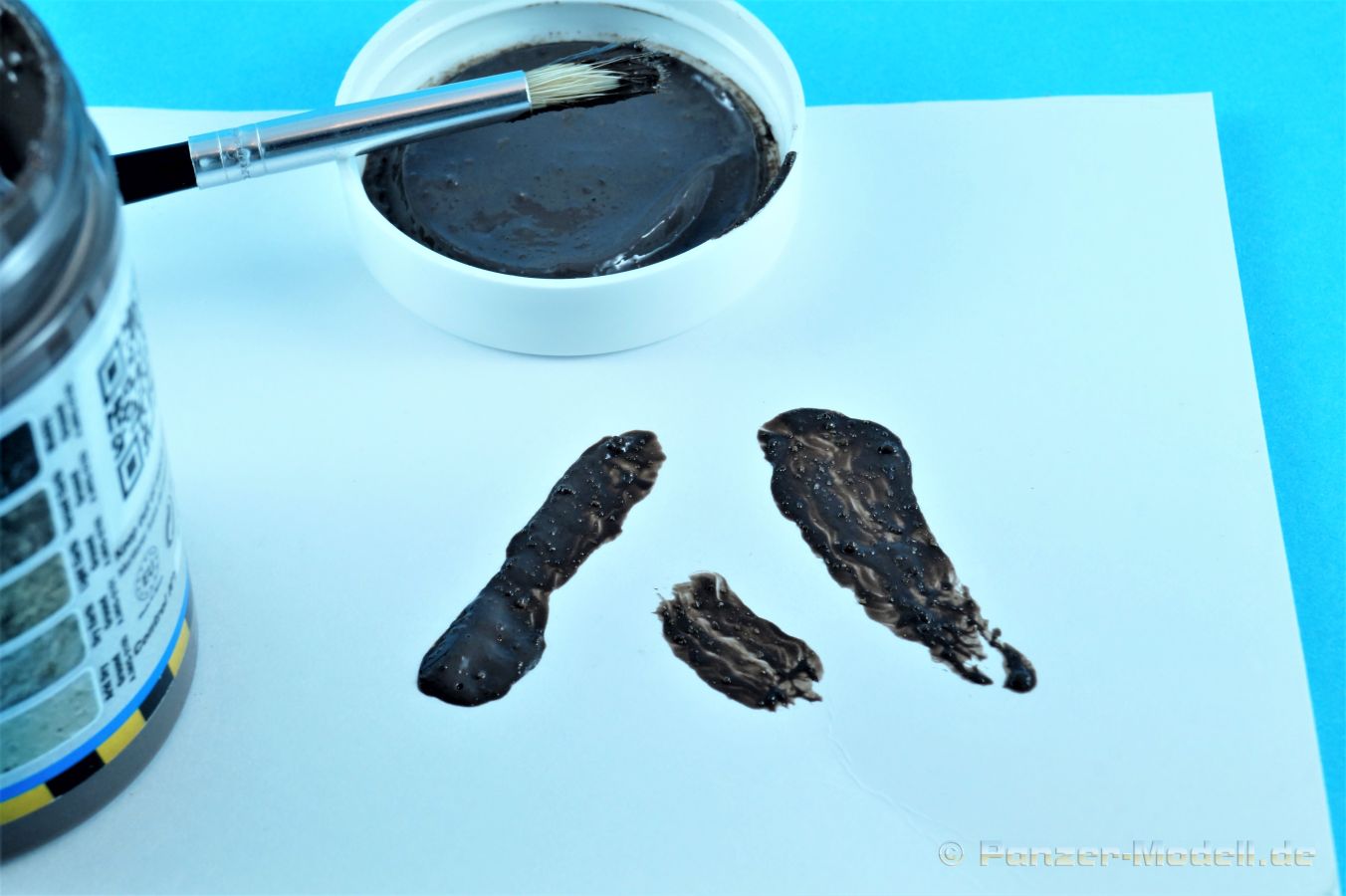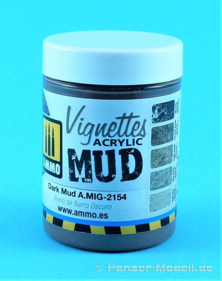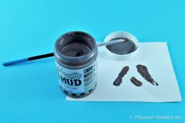 Durch die mittlerweile mannigfaltigen Hilfsmittel ist es für die Modellbauer immer leichter geworden eine überzeugende Gestaltung des Terrains auf Dioramen oder Vignetten vorzunehmen. Das Produkt kommt in einem klaren Kunststoffbecher mit Schraubverschluß auf unseren Basteltisch. Die Füllmenge des Gebindes beträgt modellbaufreundliche 100ml. Größere Gebinde neigen leider dazu, trotz aller Vorsicht nach längerem Nichtgebrauch auszutrocknen. In erster Linie dient diese Paste „Dunkler Schlamm“ zur Verarbeitung auf Dioramenuntergründen und Vignetten. Vorsichtig angewendet kann sie aber auch bei der Verschmutzung von Fahrzeugen dienlich sein. Die Konsistenz erinnert ein wenig an eine Handwaschpaste, also leicht körnig. Vor Gebrauch sollte die Paste gründlich aufgerührt werden. Der Auftrag auf den Dioramenuntergrund erfolgt zweckmäßig mit einem Palettenmesser und/oder einem alten Pinsel. Während des Trocknungsprozesses, die Paste benötigt rund 24 Stunden zur völligen Aushärtung, können z.B. noch Ketten- oder Reifenspuren eingearbeitet werden. Das Produkt kann auch mit anderen „Mittelchen“ gemischt und somit weitere Variationen erzeugt werden.