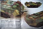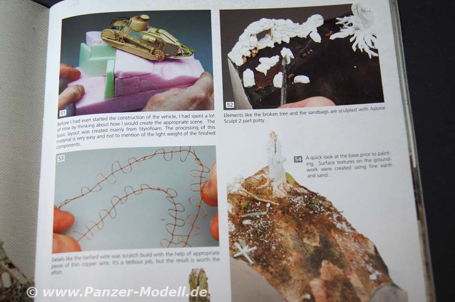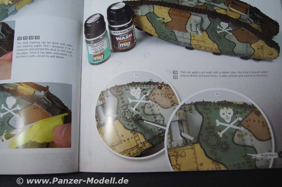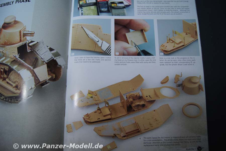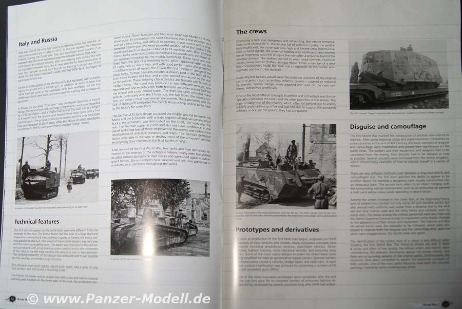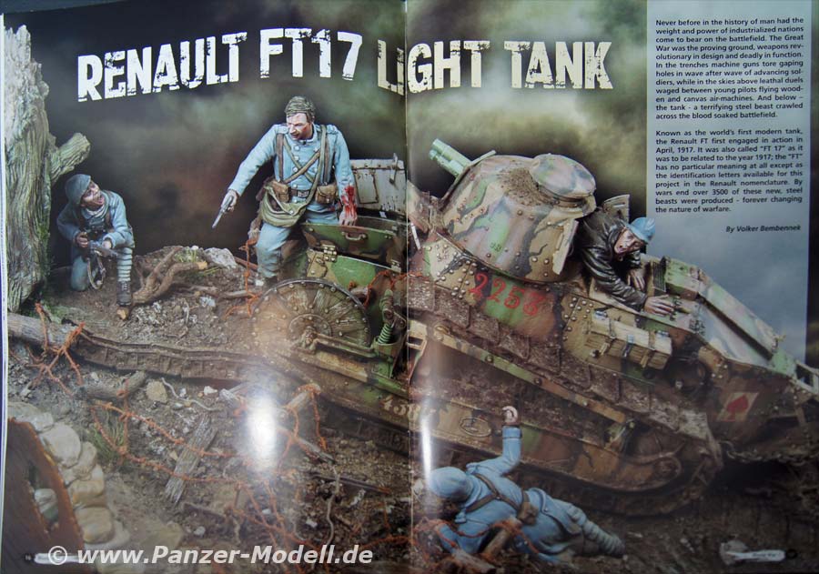 Von Seite 4 bis Seite 15 wird auf die Geschichte des 1. Weltkrieges eingegangen und die Enstehung der Panzerwaffe, die einzelen teilnehmenden Staaten werden kurz umrissen in ihrer Tankentwicklung. Untermalt wird der Bericht von Zeitgenössischen Bildern. Ab der 16. Seite geht es mit den Bauberichten los - den Anfang macht hier Volker Bembennek mit seinem herrvoragend gemachten FT 17 Diorama. Auf 22 Seiten wird hier der Bau und die Bemalung/Alterung des Panzers und der Bau des Dioramas beschrieben. Ab Seite 38 wird der Fransösische St. Chamond Panzer von Takom behandelt. Autor ist hier John Tolcher. Insgesamt 14 Seiten umfasst der Baubereicht. Zum Abschluss erfreut uns der Meister Mig Jimenez höchtpersönlich mit Bemalungs- und vorallem Alterungstechnik am Takom Mark IV Modell „Female“. Auf den letzten beiden Seiten befinden sich Farbaufnahmen von Museumsfahrzeugen. Als kleines Schmakerl legen die Macher vom Weathering Magazin noch ein Extra Heft mit Farbprofilen zu WWI Tanks für lau mit dabei, es sind richtig schöne Anregungen um seinem Panzer das richtige Outfit mit Zeit und Ortsangabe zu verpassen. Das Extraheft umfasst insgesamt 24 Seiten und 34 Farbprofile.