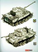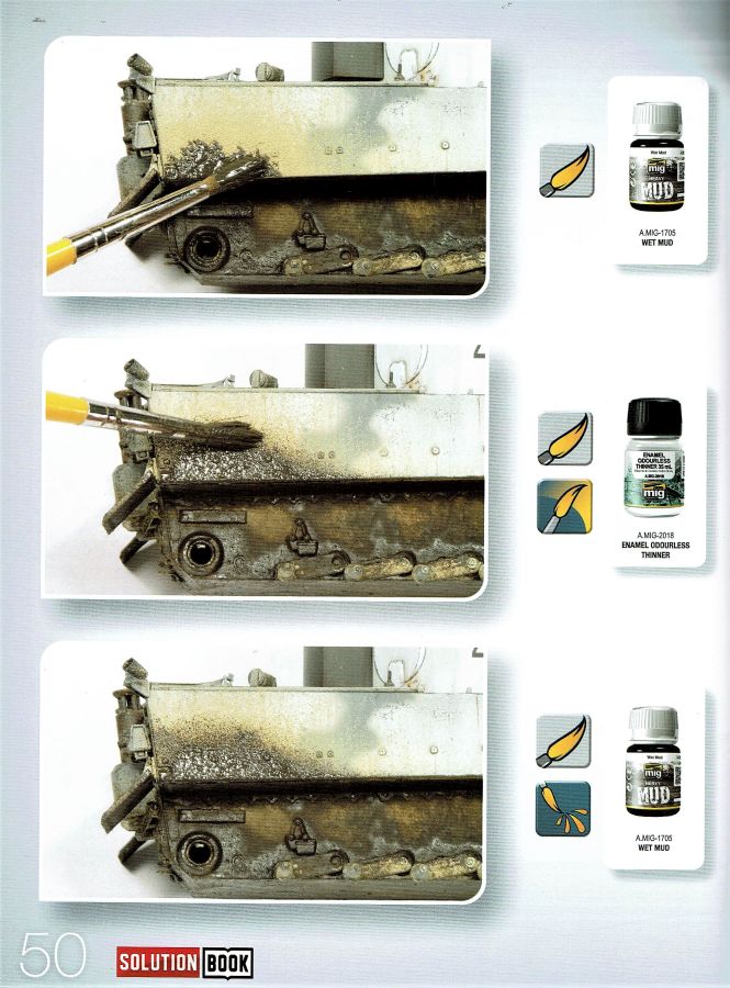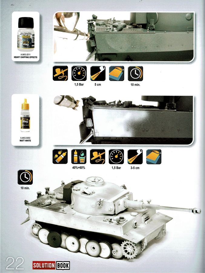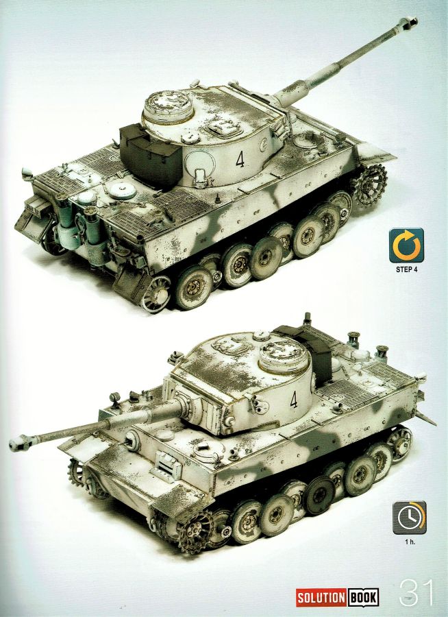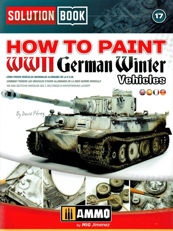 Das Heft mit 68 Seiten Umfang ist als Ratgeber schlechthin zu betrachten, ausgelegt durchgängig in vier Sprachen. Englisch, Spanisch, Französisch und Deutsch. Ein Ratgeber wie man deutsche Fahrzeuge in Wintertarnung darstellt und altert. Alle Techniken sind nachvollziehbar dargestellt und dürften auch Anfängern (nicht nur!) eine gute Hilfe sein. Es sind schnelle und einfache Methoden die jeder Modellbauer nachvollziehen kann. Egal ob Anfänger oder auch Profi. Das Objekt für die vorgestellten Techniken ist ein Tiger I early von Ryefield, gebaut von David Pérez. Nach einer kurzen Einleitung werden auf den nächsten zehn Seiten die verwendeten Produkte vorgestellt und beschrieben. Angefangen mit der Grundierung geht es u.a. über Farben, Washes, Oilbrushers, Splashes bis hin zu Mitteln zur Darstellung von Fuel and Oil. Verarbeitungshinweise und Verwendungsmöglichkeiten; alles auf den Punkt. Auf der nächsten Seite werden alle Piktogramme aufgezeigt die in den folgenden Schritten zur Anwendung kommen. Arbeitsweise, Sprühdruck, Mischungsverhältnisse u.s.w. Die einzelnen Arbeitschritte stellen sich wie folgt dar: 01. Grundierung 02. Abgenutzte weisse Tarnung 03. Filter 04. Washes 05. Weisse Streifen und Flecken 06. Schlierenbildung 07. Weisse Abplatzer 08. Staub und Erde 09. Getrockneter Schlamm 10. Feuchter Schlamm 11. Laufrollen 12. Öl- und Kraftstoffflecken 13. Bearbeitung der Ketten Jedem einzelnen Schritt ist ein kleiner Textblock vorangestellt der noch einmal kurz und informativ auf das verwendete Material eingeht. Die Fotos selbst kommen ohne Text daher und sind nur mit sehr leicht verständlichen Piktogrammen versehen. Dazu angegeben sind die verwendeten Produkte. Am Ende gibt es noch ein Gesamtfoto des fertig realistisch gealterten und verschmutzten Modells. Dazu noch die Verweise zu den einzelnen Farben und Mitteln die an den entsprechenden Stellen zum Einsatz kamen. Den Abschluß bildet eine Seite, die mit sechs deutschen Kettenfahrzeugen in der Seitenanschicht aufwartet. U.a. Panther Ausf. G, SdKfz 250/2 u.a. Aus meiner Sicht wieder ein durchaus lohnendes Produkt. Definitiv für Anfänger aber auch für Fortgeschrittene die ihre Techniken verbessern wollen. Da wird immer mal wieder nachgeschlagen. Zumal das Heft auch mit dem moderaten Preis punktet. Special thanks to Ammo of Mig for the sample.