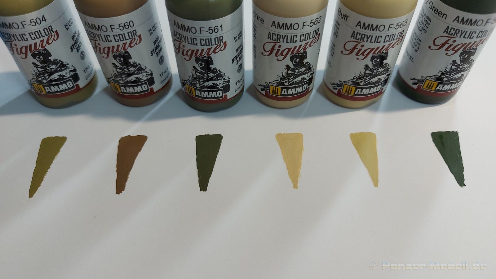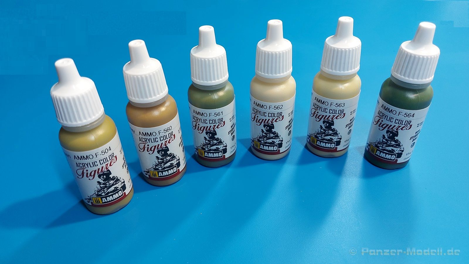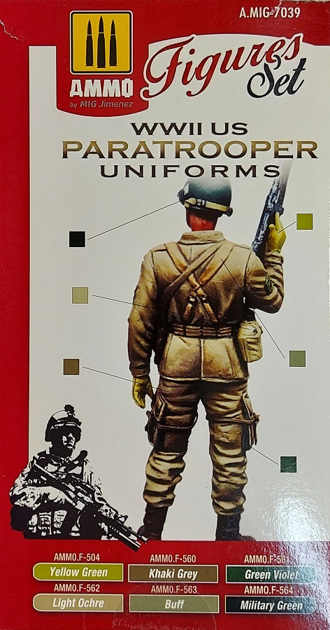 Zur Bemalung der Uniformen von Fallschirmjägern der US-Armee im 2. Weltkrieg dient das Farbset WWII US Paratrooper Uniforms von Ammo by Mig mit der Artikelnummer A.MIG-7039. In der Blisterverpackung befinden sich 6 Acrylfarben in 17ml Tropfflaschen: · AMMO-F504 Yellow green Diese Farben wurden speziell für Figurenmodellbauer entwickelt und sind von Pigmentdichte und Konsistenz auf die Verwendung mit Pinseln spezialisiert, können aber auch mit der Airbrush verarbeitet werden, wenn sie entsprechend verdünnt werden. In jeder Flasche befindet sich bereits eine Stahlkugel, mit der man die Farbe schnell und einfach effektiv aufschütteln kann. Die Farben sind wasserlösliche Acrylfarben und nicht giftig Special thanks to Ammo of Mig for the sample.