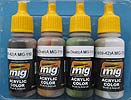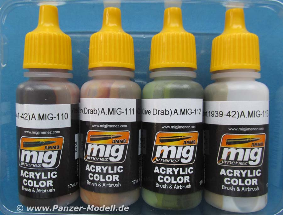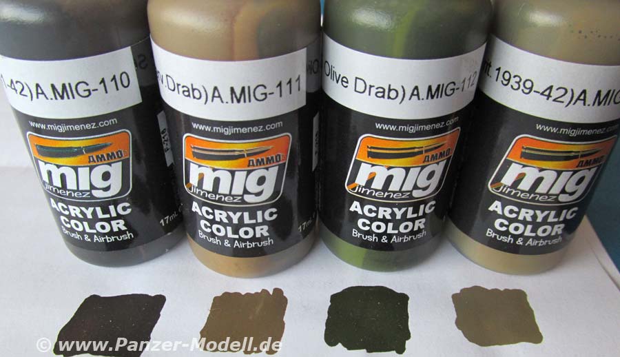 Mit der Art. Nr.7140 bietet Ammo of Mig nun ein Farbset zur Bemalung von britischen Fahrzeugen im Einsatz auf dem europäischen Kriegsschauplatz. Im Set enthalten sind 4 kleine Tropfflaschen mit je 17ml Inhalt. Es handelt sich hierbei um Acryl-Farben auf Wasserbasis. Sie sind sowohl mit dem Pinsel als auch mit der Airbrush zu verarbeiten. Je nach Airbrush Typ können diese unverdünnt oder nachverdünnt verwendet werden. Die Qualität der Farben ist ganz ausgezeichnet mit sehr feiner Pigmentierung und einemschwach seidenmatten Ton, der extrem realistisch in diesem Maßstab wirkt. Enthalten sind folgende Farben: A.MIG-110 SCC 1A (BRITISH BROWN 1941-42) Die ausgewählten Farbtöne machen einen ausgezeichneten Eindruck. Die farbtöne sind so ausgewählt, dass man von 1939 bis 1945 alle Farbversionen den Briten umsetzen kann ohne mühsam die richtigen Farbtöne zusammenzumischen. Das Farbset kostet 6,90 € und kann direkt bei Ammo of Mig bezogen werden. Special thanks to Mig Jimenez for the sample.
