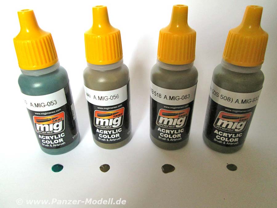 Enthalten sind vier kleine Farbflaschen mit verschiedenen grünen Farbtönen zu je 17ml Inhalt inklusive einer kleinen Stahlkugel. Diese Kugel dient bekanntlich dazu die Farbe durch schütteln der Flasche leichter und schneller anzumischen. Wie auch bei den bisherigen Farbsets ist die Verwendung mit Pinsel und Airbrush möglich. Folgende Farben sind enthalten: A.MIG 053 Protective NC 1200 Wer schon immer auf der Suche nach einem passenden Grünton für Modelle russischer Fahrzeuge war kann hier fündig werden. Das Set kostet 9,20 EUR und kann direkt beim Hersteller oder im örtlichen Fachhandel bezogen werden. Special thanks to Mig Jimenez for the sample.