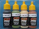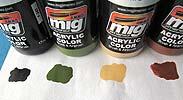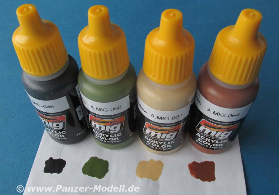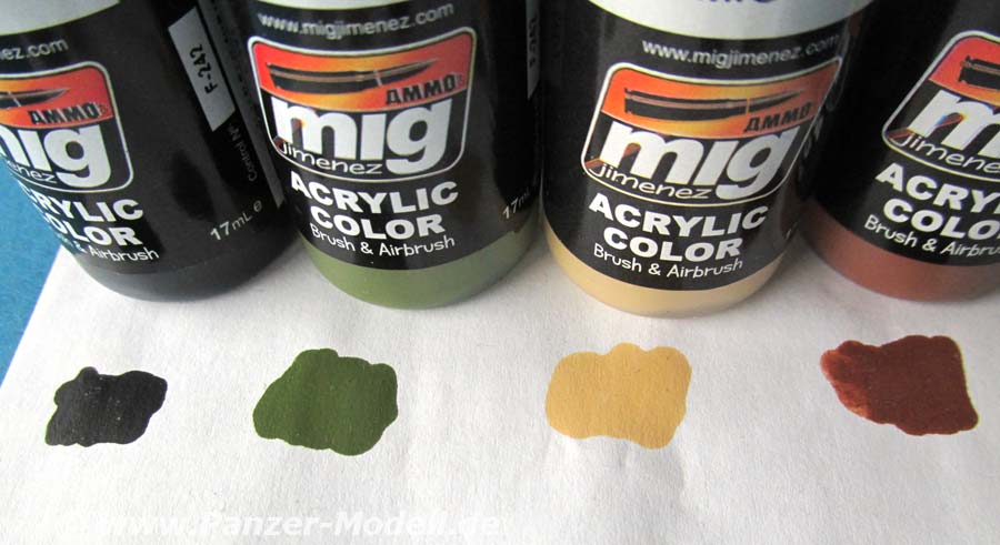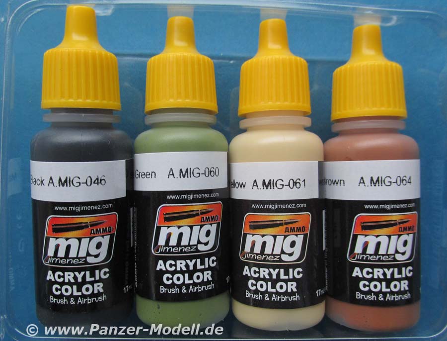 Mit der Artikelnummer A.MIG 7151 ist von Ammo of Mig ein Farbset für die Bemalung von modernen französischen Fahrzeugen. Die Farben lassen sich aber natürlich auch anderweitig verwenden. Das Farbset beinhaltet 4 kleine Flaschen mit je 17ml Inhalt. Die Acrylfarben auf Wasserbasis sind geruchsneutral und angeblich sogar ungiftig. Folgende Farben sind in dem Set enthalten: A.MIG-046 Matt Black Auch bei diesem Set sind die Verschlusskappen der Flaschen gelb anstatt dem üblichen orange. Daran lässt sich erkennen, dass in diesen Flaschen eine rostfreie Metallkugel enthalten ist, die das erste Anmischen innerhalb der Flasche ganz erheblich erleichtert. Das Farbset kostet 9,20 EUR und kann direkt bei Ammo of Mig oder auch im örtlichen Modellbauhandel bezogen werden. Special thanks to Mig Jimenez for the sample.