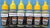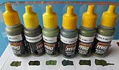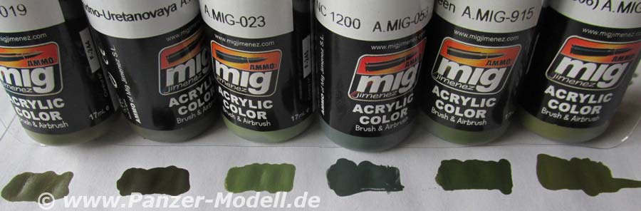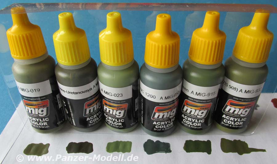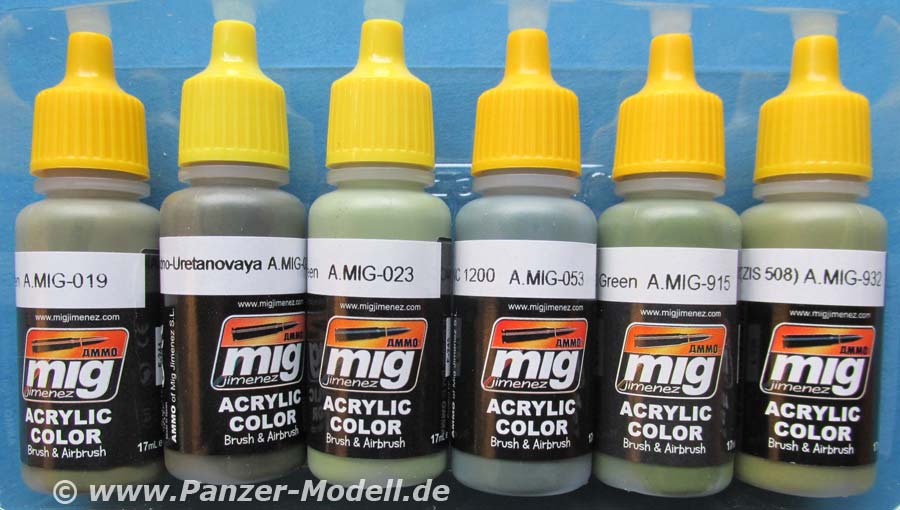 Mit der Artikelnummer A.MIG 7160 ist von Ammo of Mig ein Farbset für die Bemalung von Fahrzeugen der russischen Armee im einfarbigen grün. Die Farben lassen sich aber natürlich auch anderweitig verwenden. Das Farbset beinhaltet 6 kleine Flaschen mit je 17ml Inhalt. Die Acrylfarben auf Wasserbasis sind geruchsneutral und angeblich sogar ungiftig. Folgende Farben sind in dem Set enthalten: A.MIG-019 4BO Russian Green Auch bei diesem Set sind die Verschlusskappen der Flaschen gelb anstatt dem üblichen orange. Daran lässt sich erkennen, dass in diesen Flaschen eine rostfreie Metallkugel enthalten ist, die das erste Anmischen innerhalb der Flasche ganz erheblich erleichtert. Das Farbset kostet 13,80 EUR und kann direkt bei Ammo of Mig oder auch im örtlichen Modellbauhandel bezogen werden. Special thanks to Mig Jimenez for the sample.