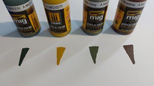 Das Farbset Regio Esercito von Ammo by Mig mit der Artikelnummer A.MIG-7180 wurde speziell für Panzer der italienischen Armee des 2. Weltkrieges zusammengestellt, kann aber auch für andere Fahrzeuge wie Lkws, Motorräder, Geschütze usw. verwendet werden. In der Blisterverpackung befinden sich 4 Acrylfarben auf Wasserbasis in 17ml Tropfflaschen: A.MIG-238 FS-34092 Medium grey Die Farben können sowohl mit dem Pinsel als auch mit der Airbrush verarbeitet werden. Je nach Airbrush Typ können diese unverdünnt oder nachverdünnt verwendet werden. Die Qualität der Farben ist ganz ausgezeichnet mit sehr feiner Pigmentierung und einem schwach seidenmatten Ton, der realistisch in diesem Maßstab wirkt. In jeder Flasche befindet sich bereits eine Stahlkugel, mit der man die Farbe schnell und einfach effektiv aufschütteln kann. Die Farben sind wasserlösliche Acrylfarben und nicht giftig. Man hat mit dem Set die ideale Basis für neue, bzw. frisch lackierte Fahrzeuge. Special thanks to Ammo of Mig for the sample.