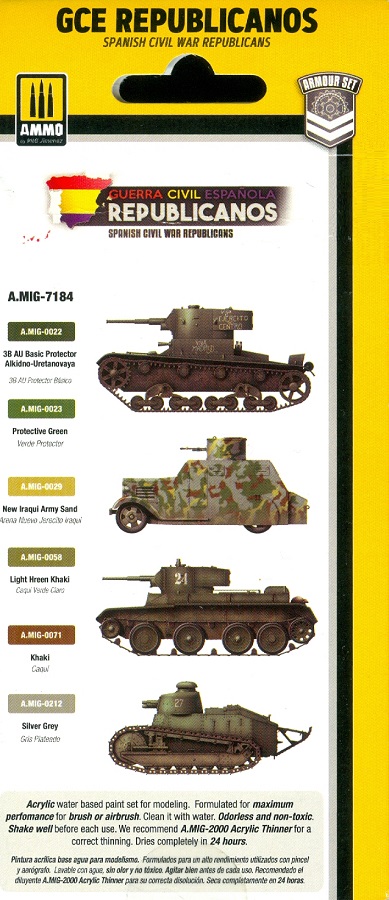 Zur Bemalung von Panzern und Fahrzeugen der republikanischen Armee während des spanischen Bürgerkrieges 1936-1939 dient das Farbset Spanish Civil War Republicans von Ammo by Mig mit der Artikelnummer A.MIG-7184. Einige Beispiele von Einfarbtarnung von z.B. T-26, BT-5 und FT-17 bis hin zu Vierfarbtarnung eines 1932-er Bilbao Panzerwagens sind auf der Rückseite der Packung angegeben. Dies sind nur Beispiele. Welche Fahrzeuge tatsächlich wie getarnt waren, recherchiert man besser selbst. In der Pappschachtel mit Seitenlasche befindet sich ein Einschubkarton mit 6 Acrylfarben auf Wasserbasis in 17ml Tropfflaschen: