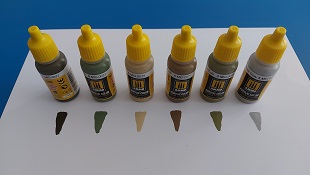 Mit dem Pinsel verarbeitet deckt die Farbe sehr gut. Typisch für Acrylfarben trocknet sie sehr schnell mit einem seidenmatten Finish. Bei Verwendung der Airbrush sollte man ggfs. etwas verdünnen. Vermehrt wird auch die Verwendung von sogenannten Flow-Improvern (Fließverbesserern) empfohlen. In jeder Flasche befindet sich bereits eine Stahlkugel, mit der man die Farbe schnell und einfach effektiv aufschütteln kann. Die Farben sind wasserlösliche Acrylfarben und nicht giftig. Ich finde diese Sets praktisch, denn so hat man die Grundtarnfarben gleich beisammen, ohne selbst suchen zu müssen, denn der Hersteller hat die Farbtöne bereits entsprechend recherchiert. Man muss nur beachten, dass es sich nur um die Tarnfarben handelt und man noch andere Farben wie für die Bemalung von Reifen, Ketten, Werkzeugen und anderem benötigen wird.