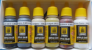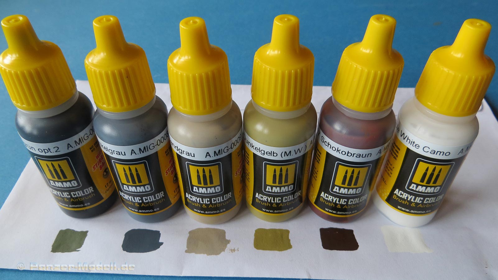 Mit diesen Farbtönen kann der geneigte Modellbauer den Großteil der möglichen Tarnschemen der frühen Fahrzeuge von 1939 bis 1943 realisieren - begonnen mit den einfarbigen Schemen in dunkelgrau über Farbschema in Afrika, Wintertarnungen, dunkelgelb einfarbig und frühe Dreifarbtarnungen. Die Farben können sowohl mit dem Pinsel als auch mit der Airbrush verarbeitet werden. Je nach Airbrush Typ können diese unverdünnt oder nachverdünnt verwendet werden. Die Qualität der Farben ist ganz ausgezeichnet mit sehr feiner Pigmentierung und einem schwach seidenmatten Ton, der realistisch in diesem Maßstab wirkt. In jeder Flasche befindet sich bereits eine Stahlkugel, mit der man die Farbe schnell und einfach effektiv aufschütteln kann. Die Farben sind wasserlösliche Acrylfarben und nicht giftig. Ein ideales Set für den Wehrmachtsmodellbauer, der farbmäßig neu in dieses Thema einsteigt und hiermit eine solide Basis bekommt. Special thanks to Ammo of Mig for the sample.