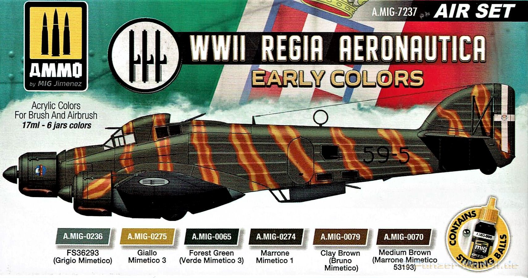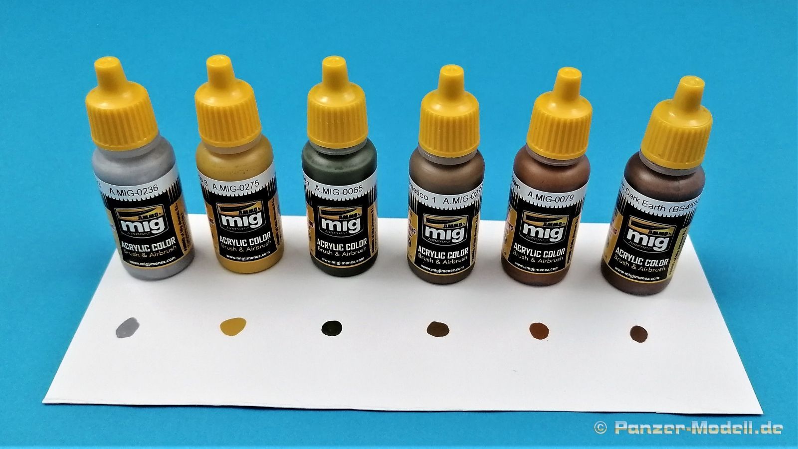Das Set beinhaltet sechs 17ml Tropffläschchen mit folgenden Farben. A.MIG-0236 FS36293 Grigio Mimetico Große Vorteil dieser Farbsets sind die aufeinander abgestimmten Farben, die man so für die Bemalung der Modelle direkt aus „einer Hand“ bekommt. Kein lästiges Suchen innerhalb eines Farbsortimentes des Herstellers, kein Selbstanmischen der benötigten Farbtöne… In den Flaschen ist jeweils eine kleine Kugel aus rostfreiem Edelstahl enthalten. Durch Schütteln der Flasche wird das Mischen der Farbe erheblich erleichtert. Die Deckkraft beim Streichen per Pinsel ist sehr gut. Die Farbe trocknet schnell, relativ glatt und mit einem leichten seidigen Glanz. Gleiches gilt bei der Verwendung einer Airbrush, hier sollte die Farbe aber trotzdem entsprechend verdünnt werden. Special thanks to Mig Jimenez for the sample.