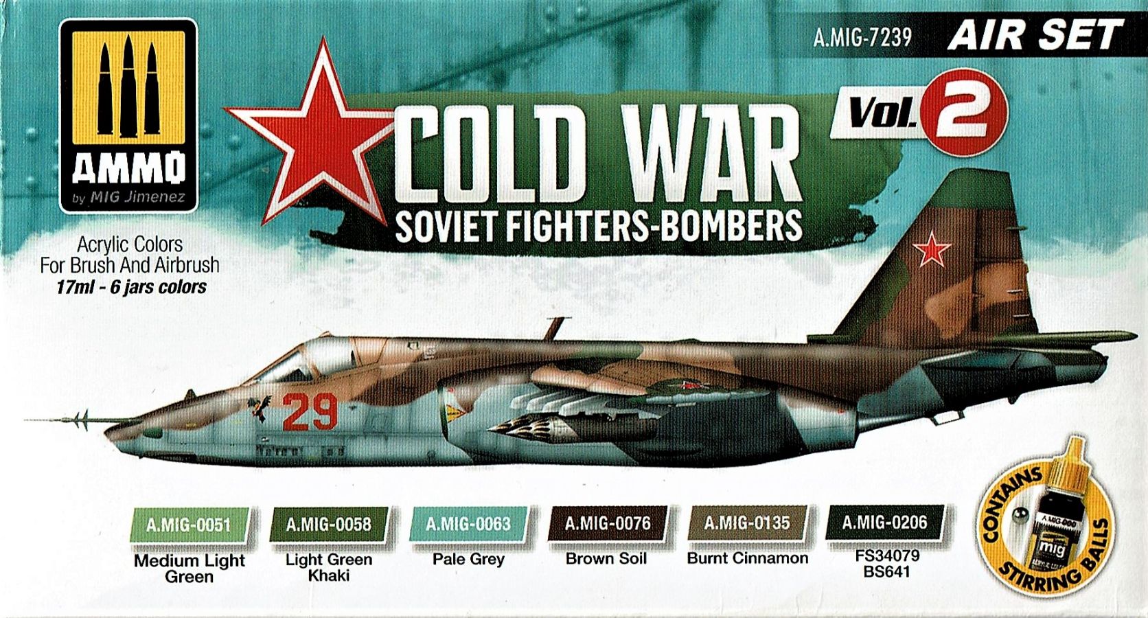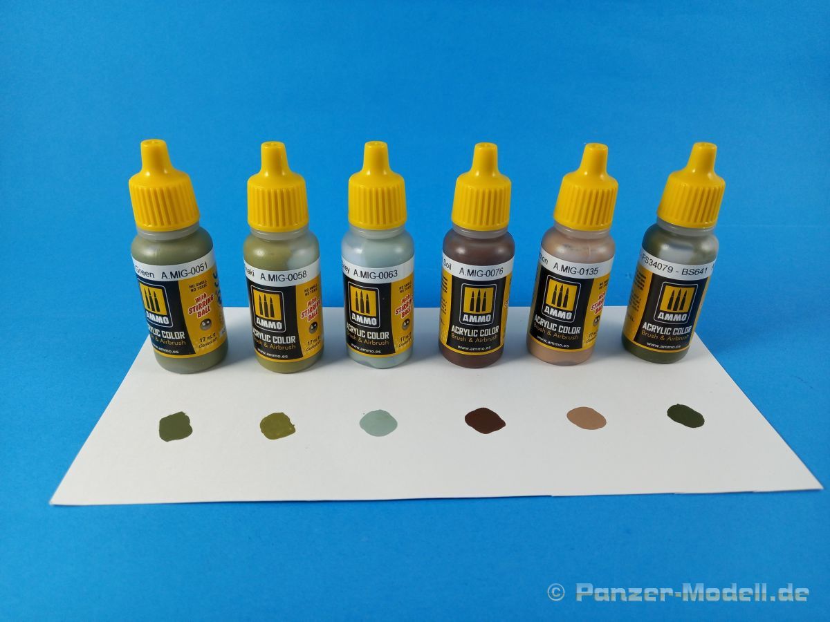 Großer Vorteil dieser Farbsets sind die aufeinander abgestimmten Farben, die man so für die Bemalung der Modelle direkt aus „einer Hand“ bekommt. Kein lästiges Suchen innerhalb eines Farbsortimentes des Herstellers, kein Selbstanmischen der benötigten Farbtöne… Das Set beinhaltet sechs 17ml Tropffläschchen mit folgenden Farben. A.MIG-0051 Medium Light Green In den Flaschen ist jeweils eine kleine Kugel aus rostfreiem Edelstahl enthalten. Diese leistet ihre guten Dienste beim Aufmischen der Farbe. Die Deckkraft beim Streichen per Pinsel ist sehr gut. Die Farbe trocknet schnell, relativ glatt und mit einem leichten seidigen Glanz. Gleiches gilt bei der Verwendung einer Airbrush, hier sollte die Farbe aber trotzdem entsprechend verdünnt werden. Vorzugsweise wird von mir „Flow Improver“ verwendet. Absolut empfehlenswert.