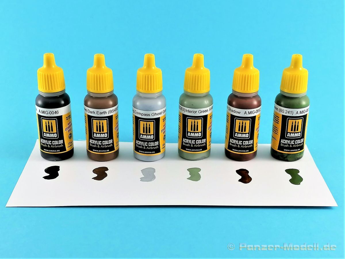 Großer Vorteil dieser Farbsets sind die aufeinander abgestimmten Farben, die man so für die Bemalung der Modelle direkt aus „einer Hand“ bekommt. Kein lästiges Suchen innerhalb eines Farbsortimentes des Herstellers, kein Selbstanmischen der benötigten Farbtöne… Das Set beinhaltet wieder sechs 17ml Tropffläschchen mit folgenden Farben: A.MIG-0046 – Matt Black In den Flaschen ist jeweils eine kleine Kugel aus rostfreiem Edelstahl enthalten. Diese leistet ihre guten Dienste beim Aufmischen der Farbe. Die Deckkraft beim Streichen per Pinsel ist sehr gut. Die Farbe trocknet schnell, relativ glatt und mit einem leichten seidigen Glanz. Gleiches gilt bei der Verwendung einer Airbrush, hier sollte die Farbe aber trotzdem entsprechend verdünnt werden. Vorzugsweise wird von mir „Flow Improver“ verwendet. Alle Farben können durchaus überzeugen. Absolut empfehlenswert.