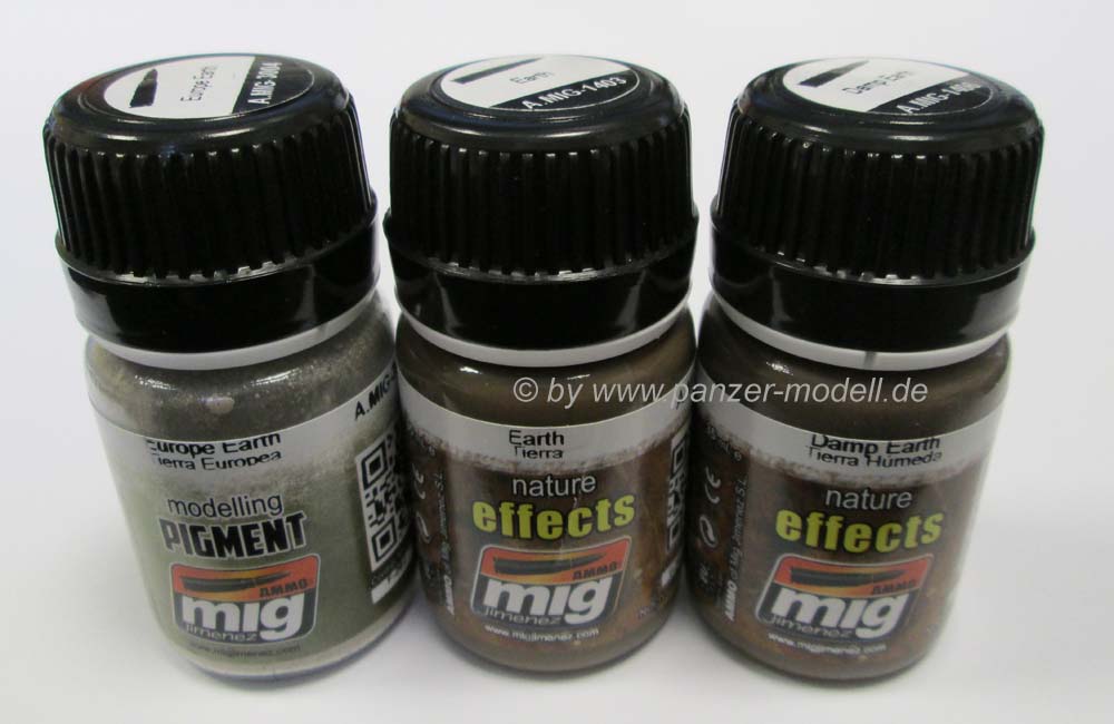 Wer sein Modell realistisch verschmutzen möchte findet hier genau die richtigen Hilfsmittel. Das Verschmutzungsset Europe Earth Set Nr. 7408 bietet alles was das Herz benötigt um ein Modell auf dem europäischen Kriegsschauplatz in Szene zu setzen. Enthalten sind drei kleine Behälter mit je 35ml Inhalt. Zum einen finden sich dort die „Europe Earth Pigments“. Ein schöner mittlerer Sandton der hervorragend den europäischen Schmutz imitiert. Weiterhin haben wir „Earth“. Diese Flüssigkeit auf Enamel-Basis stellt den Mutterboden dar. Der Farbton passt wirklich perfekt um trockene Erde darzustellen. Man kann die Flüssigkeit direkt aus dem Behälter mit einem Pinsel am Modell auftragen, man kann sie zusätzlich verdünnen um dünnere, subtilere Schmutzablagerungen darzustellen, man kann sie auch unmittelbar aus dem Behälter per Airbrush verdünnt oder unverdünnt auftragen und man kann sie durch Zugabe von Gips mit einer gewissen Struktur versehen um eine dickere und vor allem auch dreidimensionale Dreckschicht zu erhalten. Für die Darstellung von feuchter Erde oder feuchtem Mutterboden bietet sich „Damp Earth“ an. „Damp“ steht in diesem Fall für „feucht“ und enthält einen etwas kräftigeren, dunkleren Farbton. Mit diesem Set erhält man alles was man braucht um eine tolle und vor allem realistische Verschmutzung am Modell anzubringen. Die Töne der Pigmente und den beiden Flüssigkeiten sind perfekt aufeinander abgestimmt. Was will man mehr? Ein echtes „Rundum-Sorglos-Paket“. Anbei die Artikelnummern der einzelnen Produkte: Earth: A.MIG-1403 Das Sortiment von Ammo of Mig kann direkt über die Webseite des Herstellers bezogen werden. Das Set kostet 10,80 €, einzeln kosten die jeweiligen Behälter 3,60 €. Special thanks to Mig Jimenez for the sample.