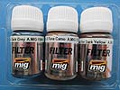 Mit der Art. Nr.7453 bietet Ammo of Mig nun ein Filterset für deutsche Fahrzeuge. Im Set enthalten sind 3 Schraubdeckelgefäße aus Plastik mit je 35ml Inhalt. Es handelt sich hierbei um eine verdünnte Emaille Farblösung, die man ohne Gefahr des Farbanlösens auf Acrylfarbanstrichen verwenden kann. Der Sinn der Filter liegt darin farbliche Nuancen auf dem Anstrich zu schaffen, die bei einfarbigen Lackierungen das subjektiv fürs Auge interessanter machen und die Eintönigkeit brechen sollen, auf Mehrfarbabstrichen bringt man durch Filter eine farbliche Abstimmung der verschiednene Farben aufeinander, sowie eine Erhöhung der farblichen Tiefe, wodurch das Modell gefälliger und realistischer wirkt. Enthalten sind folgende Farben: A.MIG-1509 Blue For Dark Grey Die ausgewählten Farbtöne machen einen ausgezeichneten Eindruck und sind so ausgewählt, dass man für die Grundlackierungen der deutschen Fahrzeuge zumindest einen entsprechenden Filter hat ohne sich diese ständig selber neu anmischen zu müssen. Es ist ein bläulicher Filter für die dunkelgraue Lackierung sowie ein brauner Farbton für sandgelbe Fahrzeuge und ein gelbbrauner farbton für Fahrzeuge im typischen Dreifarbton. Das Farbset kostet 10,80 € und kann direkt bei Ammo of Mig bezogen werden. Special thanks to Mig Jimenez for the sample.