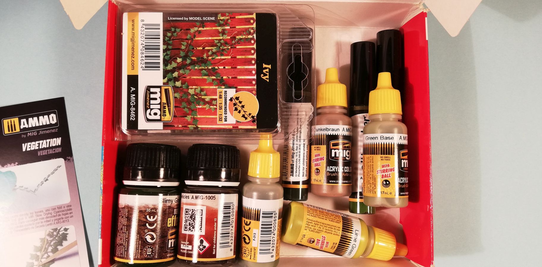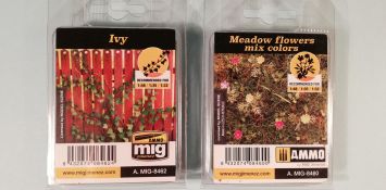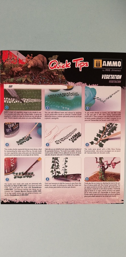 Ammo by MIG bietet ein neues Komplettset für die Bemalung von Pflanzen. Unter der Nummer 7806 wird das Vegetation Solution Set quasi als Rund-um-sorglos-Lösung angeboten. Das Farbset kommt in einem Klappkarton mit der typischen Ammo-Farbgestaltung. Der Blick auf die Rückseite verrät bereits alle enthaltenen Artikel. Neben einer Menge Farbtöpfen sind - als wirklich gute Idee - auch zwei Lasercut-Pflanzensets enthalten. Abgerundet wird das Set durch eine englischsprachige Quick Tips Anleitung. Die vier Acrylfarben in drei unterschiedlichen Grüntönen (Forrest, Lime und Base) und einem Dunkelbraun (Ral 7017) dienen zur Detailbemalung der Blätter und Äste. Mit den drei Oilbushers in den Farben Olive Green, Field Grey und Dark Brown werden Highlights an den Pflanzen gesetzt oder umliegendes Gelände bemalt. Das Slimy Grime Dark aus der nature effects-Reihe dient der Darstellung von Grünspan oder leicht bemoosten Flächen. Den Abschluss der Farbenübersicht bildet ein Dark Brown Wash für mehr Tiefe an den Pflanzen bzw. den jeweiligen Gründen. Schauen wir uns etwas näher die Quick Tips an. Wer noch nie Lasercut-Pflanzen in einem Diorama verwendet hat, bekommt hier wertvolle Einstiegshilfen. Nach dem Heraustrennen des Pflanzenstranges - in diesem Fall dem auch im Set enthaltenen Efeu (AMIG8462) - wird in groben Zügen die weitere Behandlung erklärt. Zunächst die Bemalung mit den drei grünen Arcylfarbtönen. Ein guter Hinweis ist die Verwendung zweier Stränge, um mehr Blattwerk zu erhalten. Dann ein weiterer Tipp natürliches Material zu nutzen, um dadurch dem Ast zusätzliches Volumen zu geben. Für die Tiefenwirkung wird nun das Dark Brown Wash empfohlen. Im Anschluss kann der Efeu im Diorama eingebaut werden. Auf der Rückseite der Quick Tips wird der Umgang mit dem zweiten Lasercut-Set, einem Potpourri aus Blumen (AMIG8460), beispielhaft beschrieben. Nach dem Herauslösen der Pflanzenteile werden diese auf passend abgelängte Metallpins aufgesteckt und verklebt. Im Set sind dafür gelb, rote und lilafarbene Blütenblätter enthalten. Passend dazu gibt es unterschiedliche Pflanzenblätter. Im letzten Teil dieser Tipps wird auf die Oilbrusher eingegangen, was dem gemeinen Modellbauer wieder leicht von der Hand gehen sollte. Mein Fazit: Mit den beiden Pflanzensets wird dieses Solutionset den Einstieg in die Welt der Flora sicherlich erleichtern. Der Kreative in Metall, Staub und Matsch kann nun sein Diorama mit Blumen anreichern und einige hübsche Farbakzente setzen - jenseits des Olivedrab, Panzergrau oder Rostrot. Die knapp 38 Euro bieten Farben, die im gewöhnlichen militärorientierten Sortiment fehlen dürften. Die Tipps für die ersten Schritte in Sachen Vegetation sind ausreichend, um später zu einem ausgedehnten Geländemarsch zu wachsen. Daher erhält die Box meine Empfehlung zum Kauf.Special thanks to Ammo of Mig for the sample.
