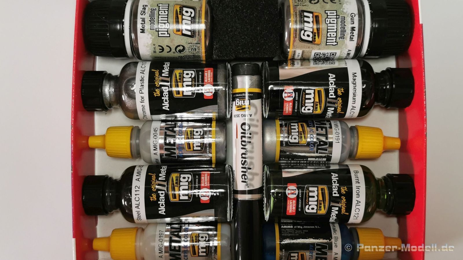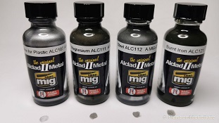 Das Set beinhaltet ein Farbsortiment zur Gestaltung von metallischen Oberflächen wie sie hauptsächlich im Bereich der Luftfahrzeuge vorkommen. Natürlich ist die Anwendung auch in anderen Bereichen denkbar, zum Beispiel bei Science Fiction Modellen. Im Set enthalten sind vier kleine Glasflaschen, die ursprünglich von Alclad stammen, mit den Farbtönen Chrom, Stahl, Magnesium und Burnt Iron, was sich mit verbranntes Eisenœ übersetzen lässt. Weiterhin sind vier der kleinen 17ml Plastikflaschen mit Acrylfarbe in den Tönen Stahl, Messing, Brüniertes Metall und Metallic Blau vorhanden. Zwei Flaschen mit Pigmenten in den Farbtönen Brüniertes Metall und Metallschlacke sowie zwei Oilbrusher (Brüniertes Metall und Silber) runden das Paket ab. Jede der enthaltenen Farben könnte man auch einzeln erwerben. Anbei die jeweiligen Artikelnummern und Bezeichnungen. Die Farbangaben von Alclad sind mit dem Kürzel ALC gekennzeichnet.