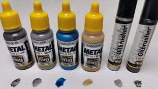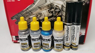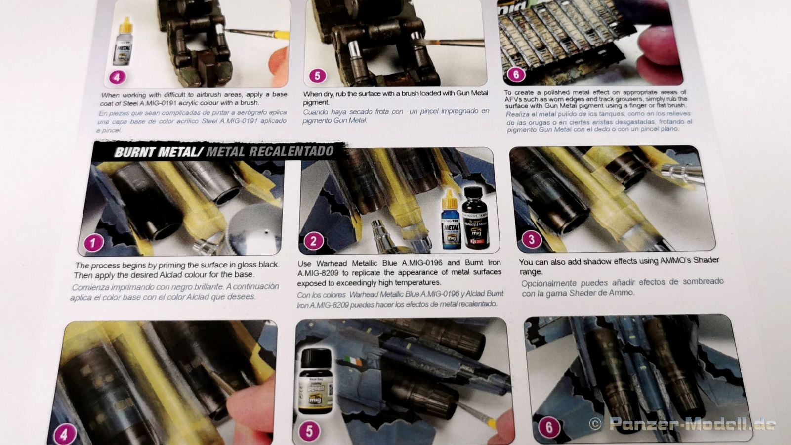 Auch ein als "Quick Tips" bezeichnetes, doppelseitig farbig gedrucktes, Blatt liegt bei. Es enthält bebilderte Anwendungstipps in Englisch und Spanisch für die Bemalung von unbehandelten und polierten Metallflächen. Und nun zum Fazit: Wir bekommen, und sogar alles aus einer Hand, mit diesem Set ein Rundum-sorglos-Paket für die realistische Bemalung von Metallflächen. Es ist alles vorhanden was der fortgeschrittene Modellbauer für solche Bemalungen benötigt. Ein mühevolles Suchen bei den Angeboten verschiedener Hersteller entfällt also. Das Komplettset kostet ca. 43,-€ und liegt preislich etwa auf gleicher Höhe wie beim Einzelkauf der Produkte. Special thanks to Ammo by Mig for the sample.