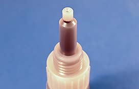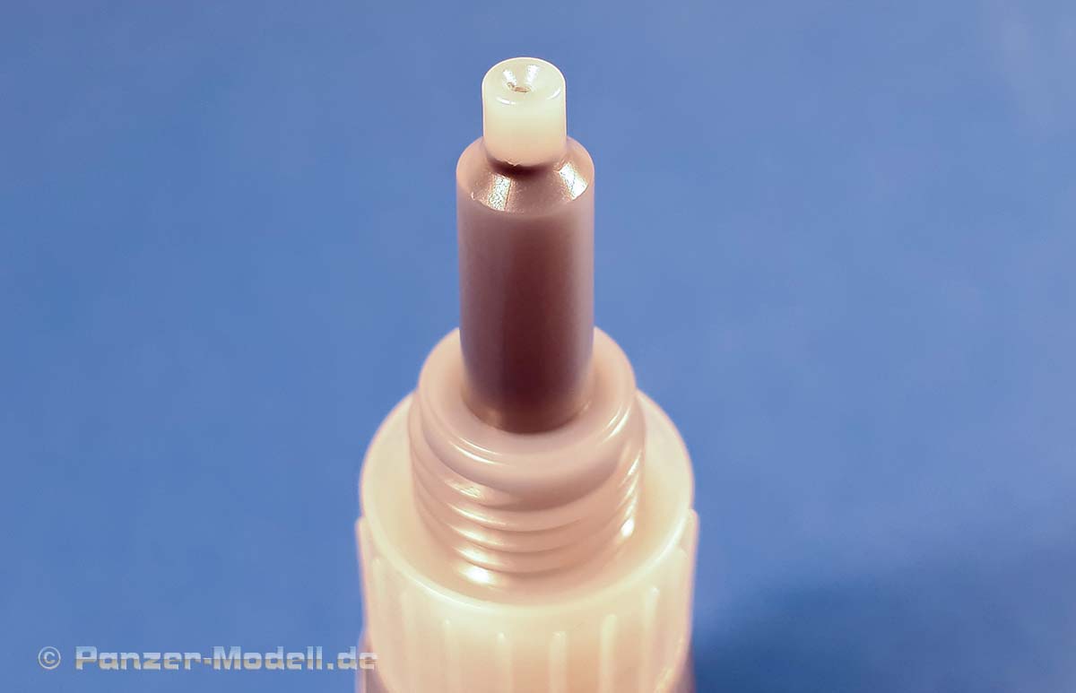 Die Öffnung ist relativ groß, sodass man nie direkt von der Flasche auf die Klebestelle arbeiten sollte, sondern sich einen Tropfen entnimmt und von dort mit einem Zahnstocher genau dosiert den Kleber verteilt.
