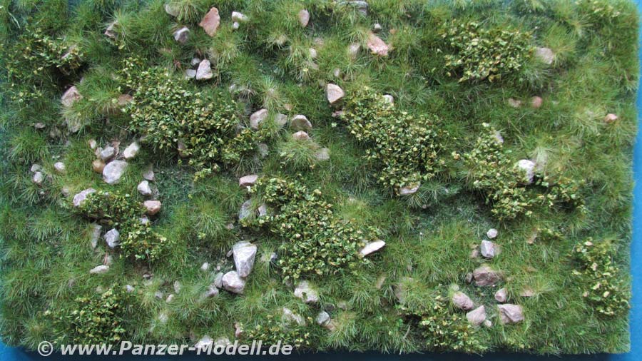 Hier bekommen wir eine 23 x 13cm große, dreidimensionale Geländematte mit aussergewöhnlicher udn realistischer und unterschiedlicher Vegetation. Zusätzlich zu dem Gras und den kleinen Büschchen sind unterschiedlich große Steine eingearbeitet.