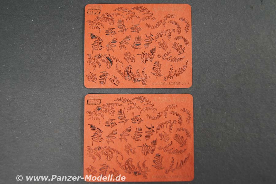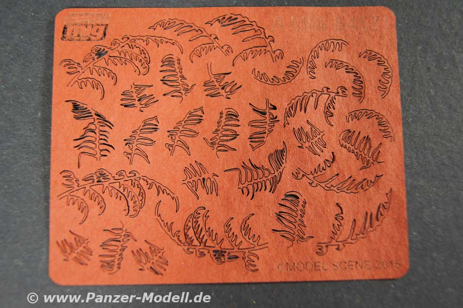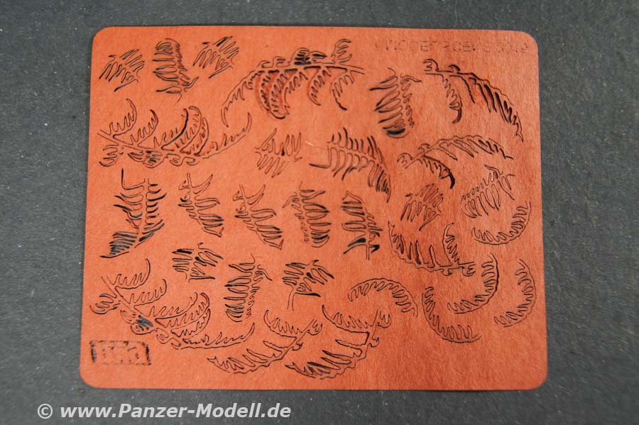 Kommen wir erst mal zum Produkt , in einer stabilen Umverpackung erwarten uns 2 Bögen á 6x7,5 cm mit ca. 30 Pflanzenteilen pro Bogen. Die Papierteile wurden sauber gelasert man muss sie lediglich noch mit einem Skalpell lösen und kann sie sofort verwenden. Was mir nicht ganz so gut gefällt ist der Grundton, ich habe selten bis gar nicht in der Natur den gelieferten Grundfarbton gesehen, der Farn ist mehr Beige, was aber an sich kein Problem darstellt einmal mit der Airbrush nachgeholfen, - fertig. Das Set ist ab sofort im Fachhandel erhältlich und schlägt mit ca. 7 Euro zu Buche.