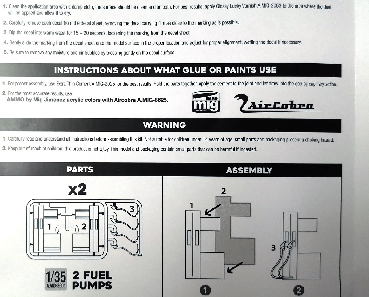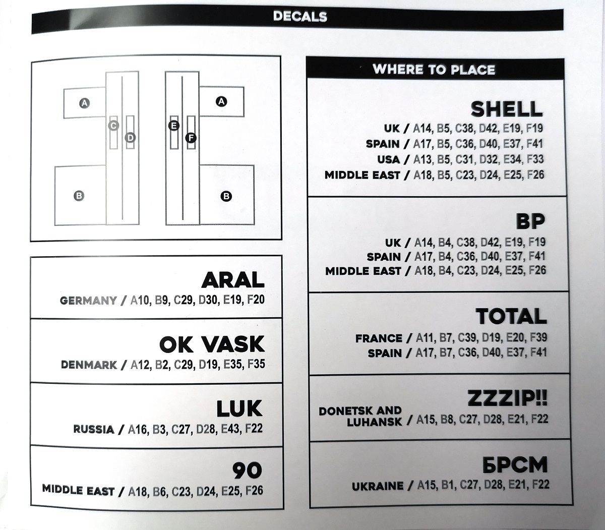 Die Kraftstoffmarken sind verschiedenen europäischen Ländern, wie z. B. Deutschland, Dänemark, England, Spanien und Frankreich zugeordnet. Aber auch der mittlere Osten, Osteuropa und Russland wurden bedacht. Zum Bau eines Dioramas fehlt allerdings der, auf dem Deckelbild der Verpackung abgebildete, Betonsockel auf dem die Zapfsäulen stehen. Darüber hinaus vermisse ich auch eine Überdachung der Zapfsäulen. Aber der Zubehörmarkt hat bereits reagiert. So bietet der spanische Kleinserienhersteller Macone Models bereits einen entsprechenden Bausatz an. Fazit: Ein sehr einfacher kleiner Bausatz, aber eine grandiose Idee für ein Diorama. Ich sehe gerade einen BMP-1 vor mir der an einer zivilen Tankstelle in der Ukraine betankt wird… Absolut empfehlenswert. Der Bausatz kann direkt bei Ammo of Mig oder auch im örtlichen Modellbauhandel bezogen werden.