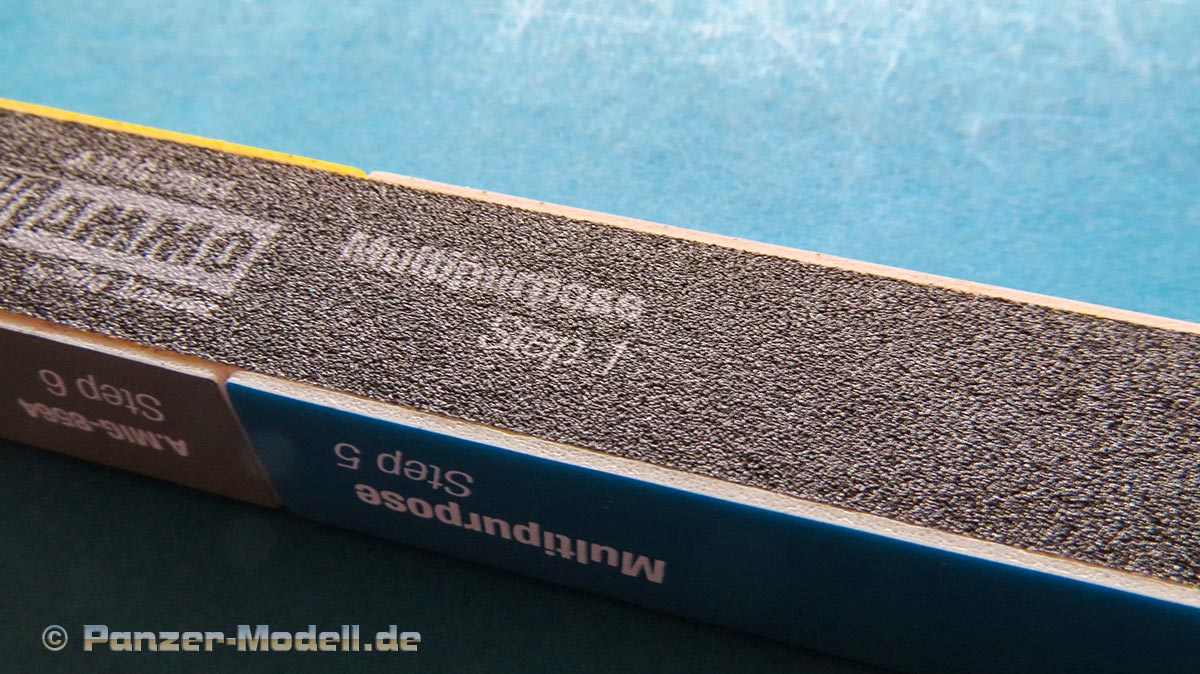 Und hier hat man sie praktischerweise schnell an einer Feile gleich zur Hand. Die verschiedenen Körnungen sind zum einen farblich unterschiedlich auf der Feile gestaltet und von grob nach fein leider nicht mit den Körnungszahlen, aber mit Step 1 bis Step 6 bezeichnet