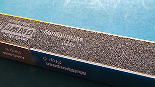 Diese Feile ist 180 x 20 x 15mm groß und ist auf 4(!) Seiten mit verschiedenen Körnungen an Schleifpapier ausgestattet - zwei der Seiten sind jeweils zur Hälfte mit zwei verschiedenen Körnungen versehen, sodass man hier auf einer Feile 6 verschiedene Körnungen zur Verfügung hat.