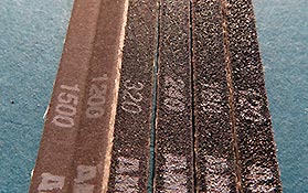 Die 120er und 180er Körnung ist gut um grobe Unsauberheiten wegzuschleifen, die 240er und 320er um feinere/kleinere Details zu entfernen und zuvor mit gröberer Körnung behandelte Flächen zu verfeinern. die 1200er und 1500er Körnungen schließlich schleifen Bereiche aufs feinste ab und verfeinern zuvor geschliffene Flächen zu einer glatten Oberfläche-