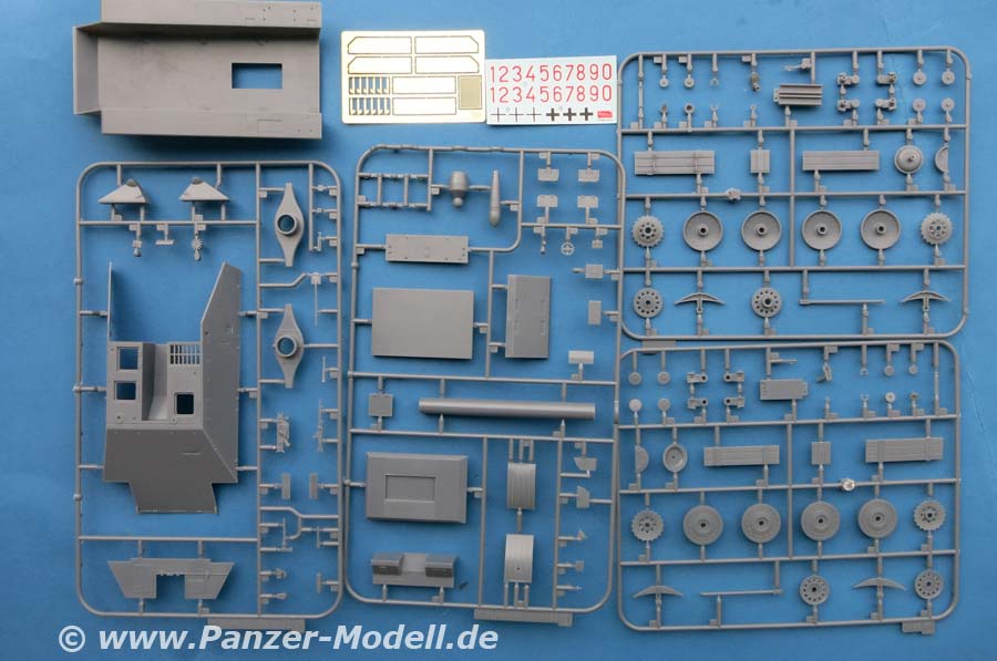 Im Karton finden wir 18 verschieden große Spritzlinge, die Unterwanne, eine Platine PE Teile und ein Decalbogen. Allein 12 dieser Spritzlinge sind aus dunkelrotem Plastik für die Kette.