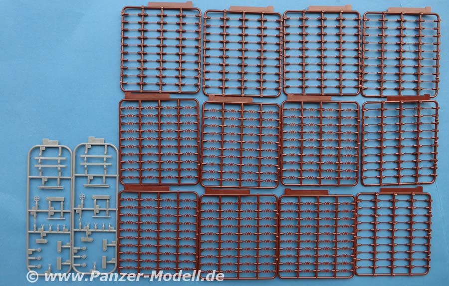 Die Ketten liegen als einzelne Glieder vor, die beweglich gebaut werden können, dazu muss zum Abschluss immer noch der Kettensteg der Laufffläche einzeln aufgeklebt werden. Ein effektives aber auch fummeliges System, auch wenn für den Zusammenbau im bausatz Bauhilfen beiliegen in denen die Glieder zusammengeführt werden. Die Kettenteile sind sehr schön sauber und detailliert gegossen - gerade die Innenflächen sind richtig schön glatt - einziger Minuspunkt ist die eingangs erwähnte Auswerferstelle aussen