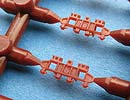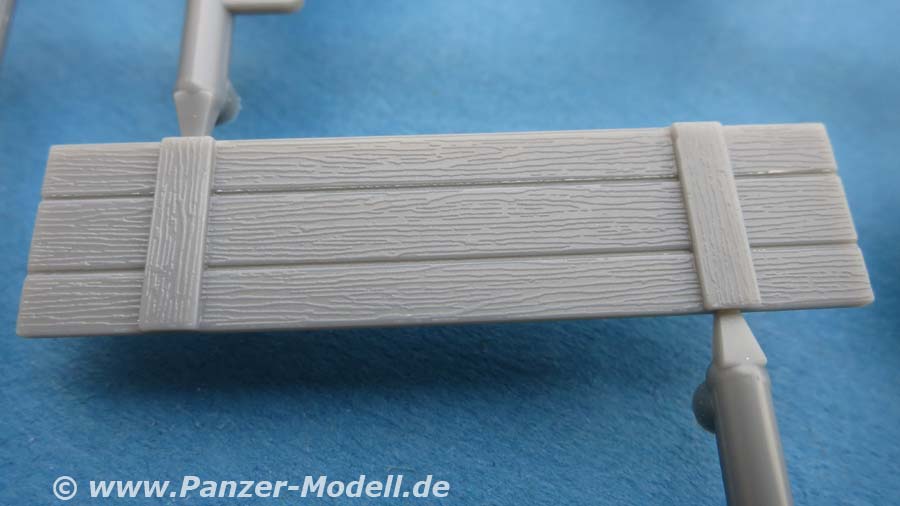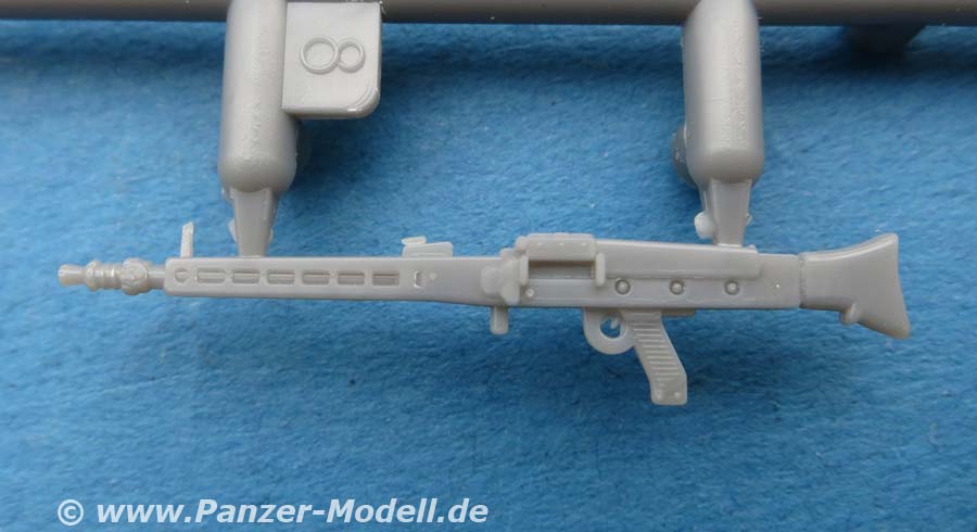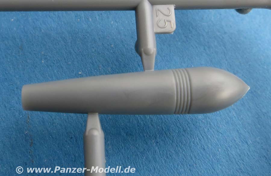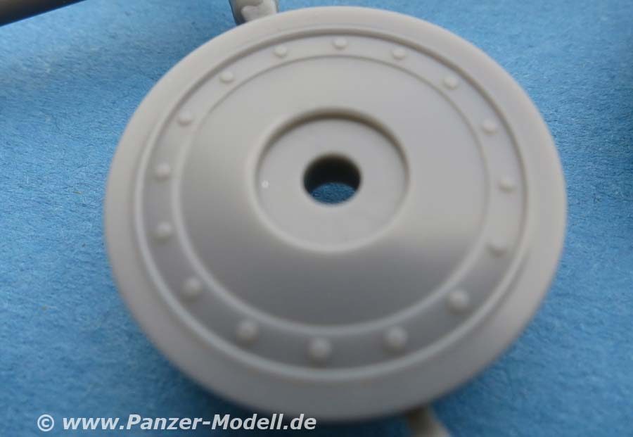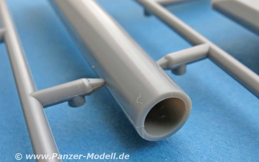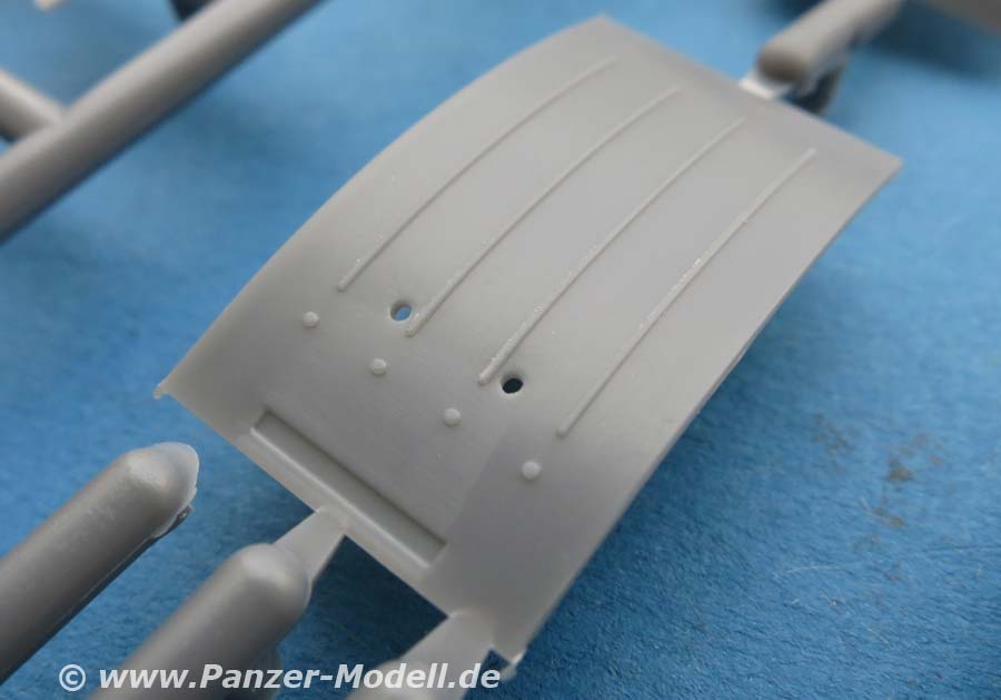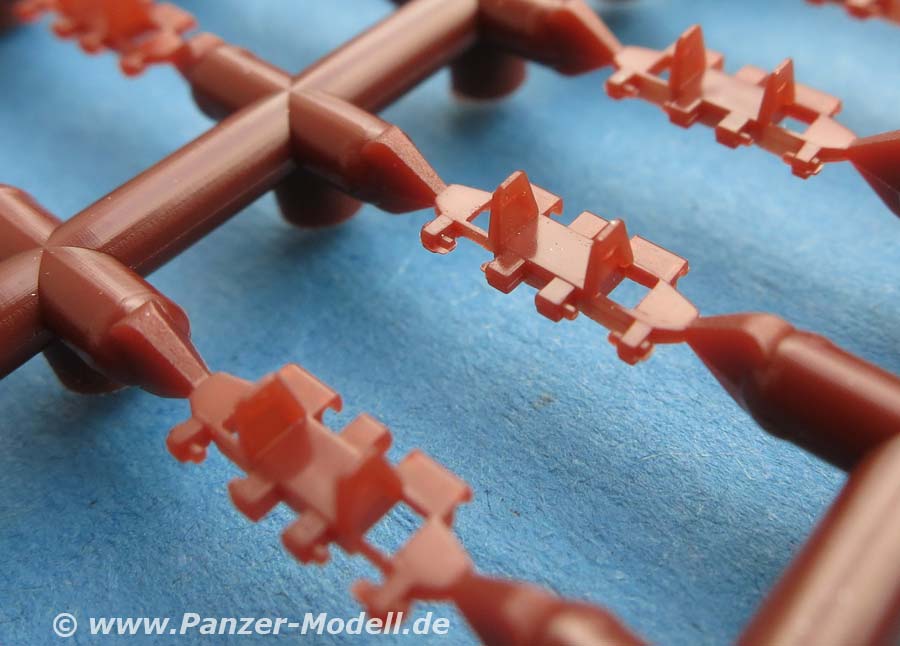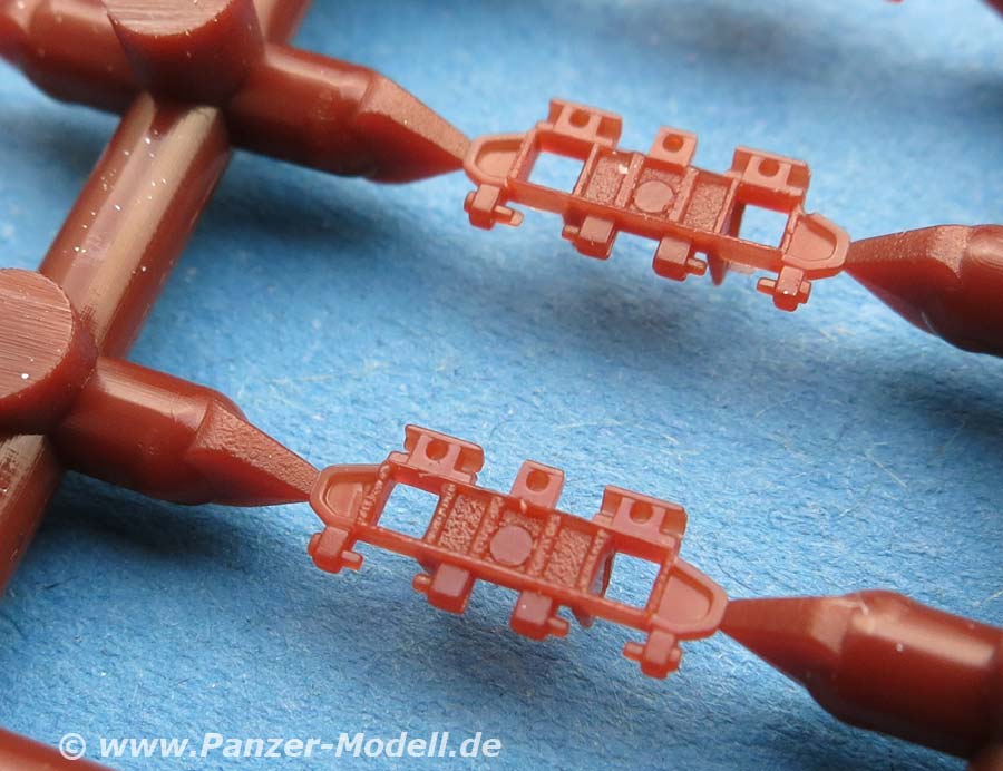 Die Spritzlinge machen durchweg einen guten Eindruck mit sauberen und feinen Details. Auswerferstellen sind fast nicht vorhanden und wenn dann nur an später nicht sichtbaren Bereichen - ausser bei den Kettengliedern wo sich mittig aussen eine runde Auswerferstelle - sehr unangenehm zur Versäuberung.