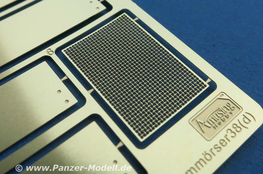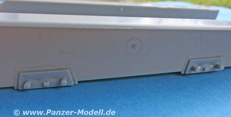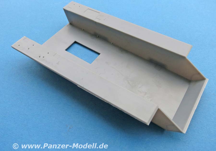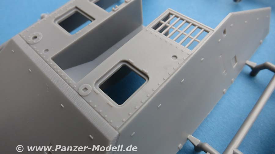 Die Unterwanne ist in einem Stück gemacht mit Ausschitt im Unterboden für das Fußstück des Mörsers, das ist die darunterliegende Bodenplatte für den Mörser greift. Auch die Oberwanne kommt in einem Stück daher und wird natürlich mit weiteren Kleinteilen verfeinert. Die Machart ist gut und sauber, Kleine Details wie Nietenköpfe sind sehr schön und fein dargestellt. Auch die groben Schnittkanten der panzerplatten sind sehr gut gelungen.
