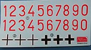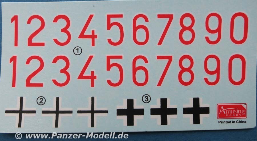 Es liegt ein generischer Decalbogen mit zwei Arten Balkenkreuzen und rot/weißen Nummern von 0-9 bei.
