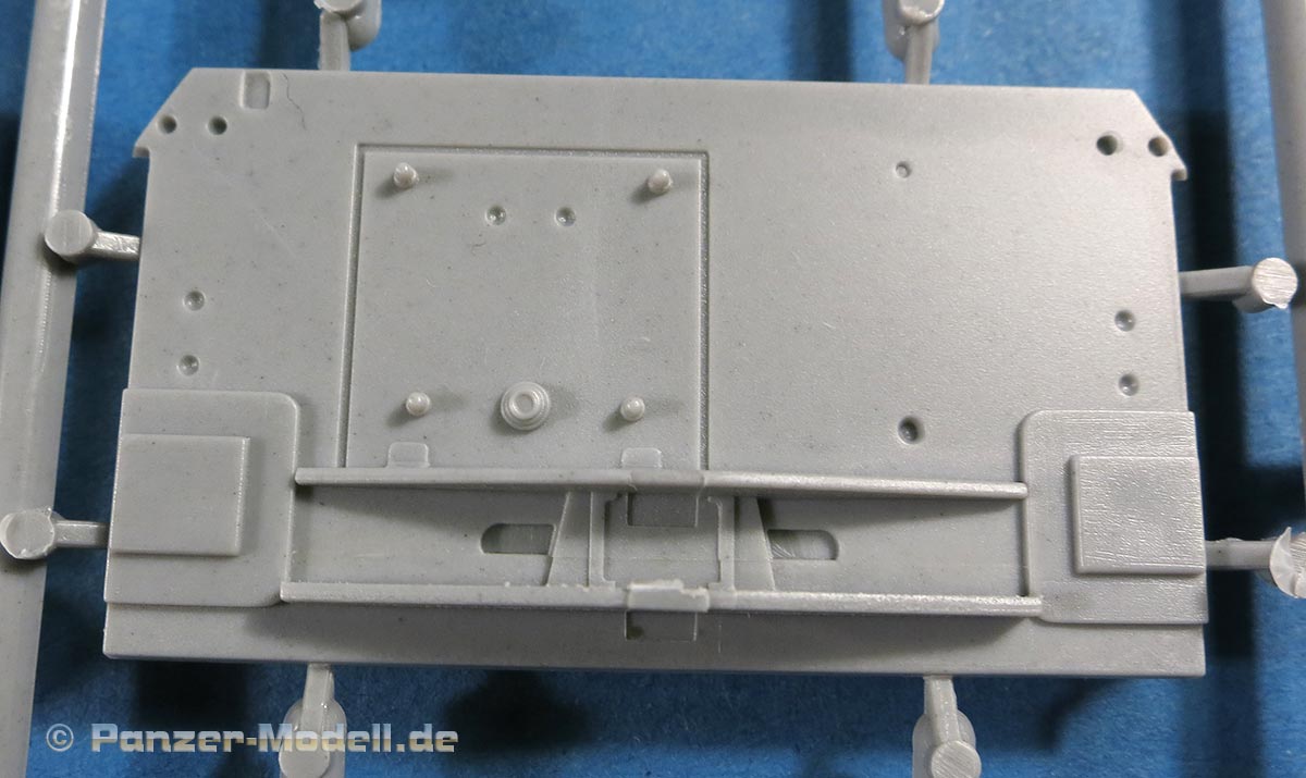 Die Unterwanne ist einteilig, was den Zusammenbau sehr erleichtert. Dafür sieht sie erstaunlich detailarm aus - keine Nieten, nur die Markierungen für den Anbau des Laufwerks und Vorgelege - das ist der große Unterschied zur genieteten Wanne der 38(t) Fahrgestelle.