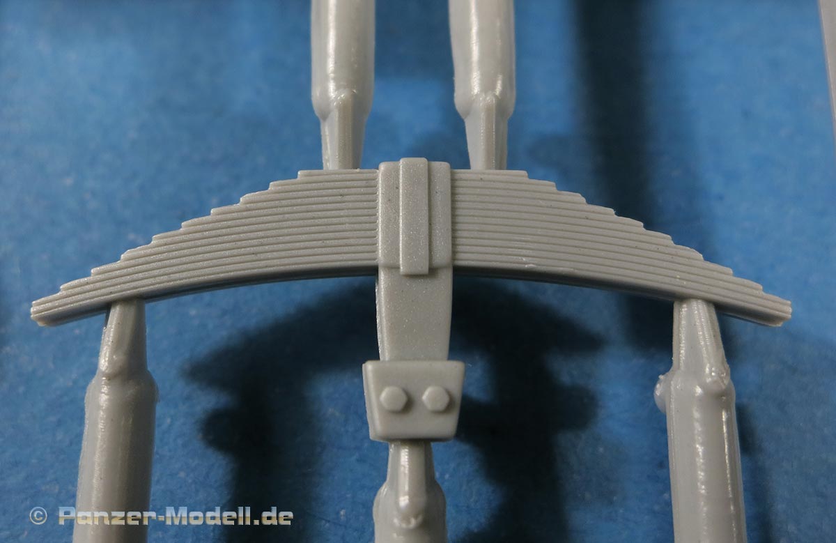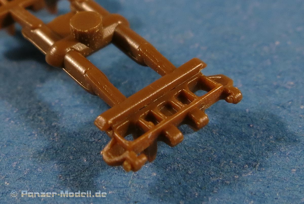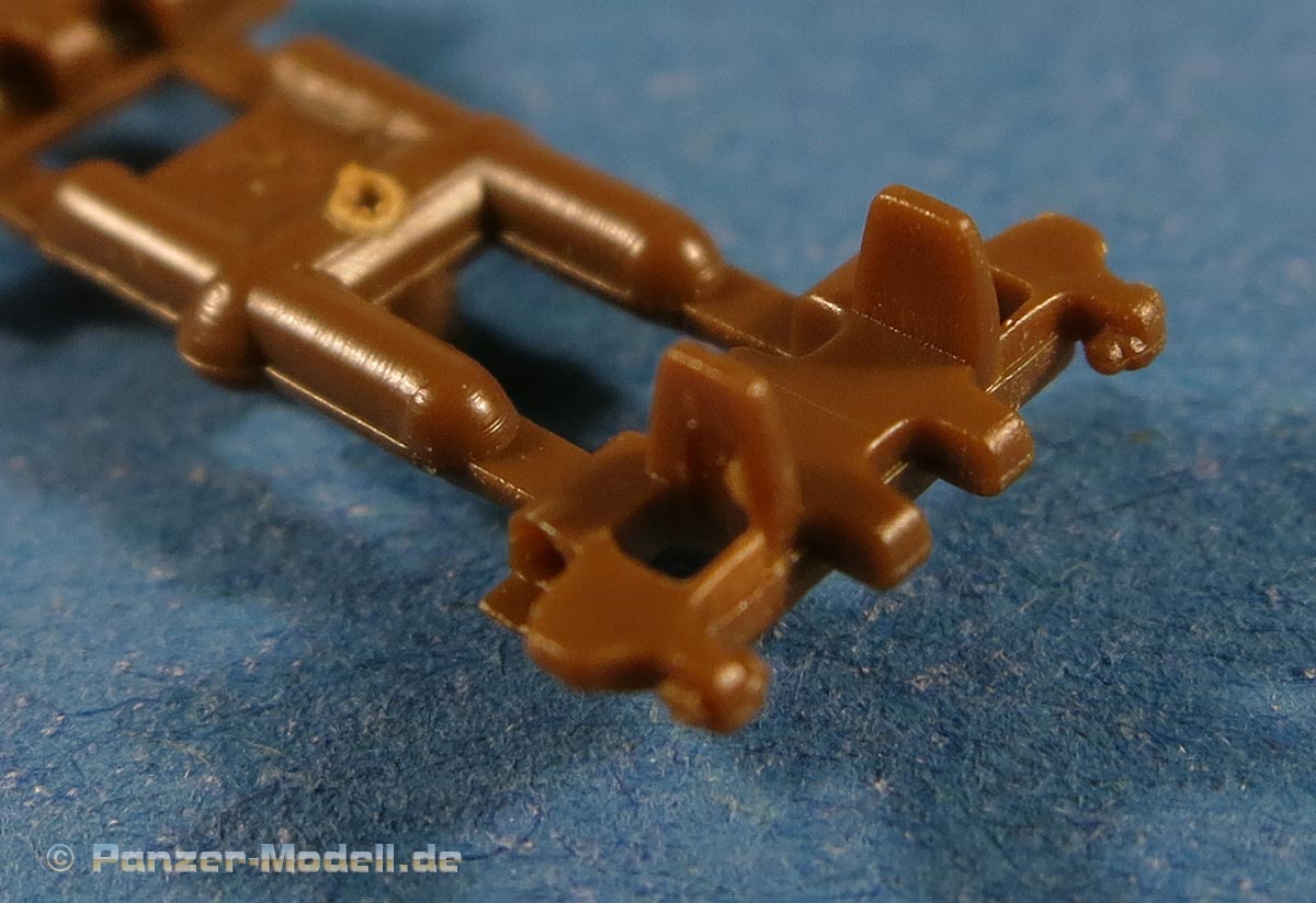 Die Ketten liegen als Einzelgliedketten bei, die mit je zwei Angüssen pro Glied zu versäubern sind. Die Detaillierung ist sehr gut und der Guss sauber und ohne Auswerferstellen. Zusätzlich erfreuen diese dadurch, dass sie einfach nur zusammengeklickt werden können, wodurch sie beweglich bleiben und insgesamt schnell zusammenbaubar sind.