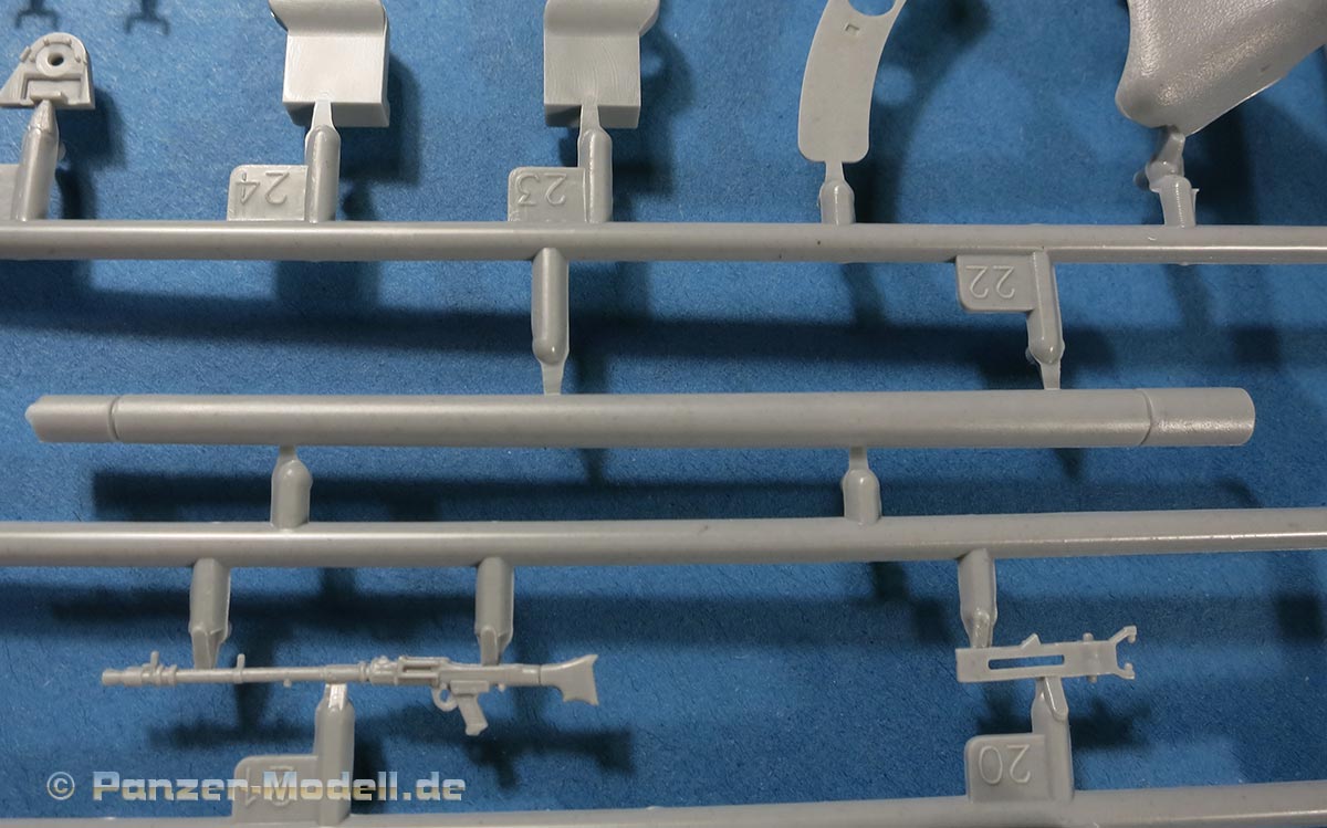 Als Waffenstation auf dem Dach liegt ein recht schönes MG34 in Plastik mit Lafette und Schutzschilden bei.