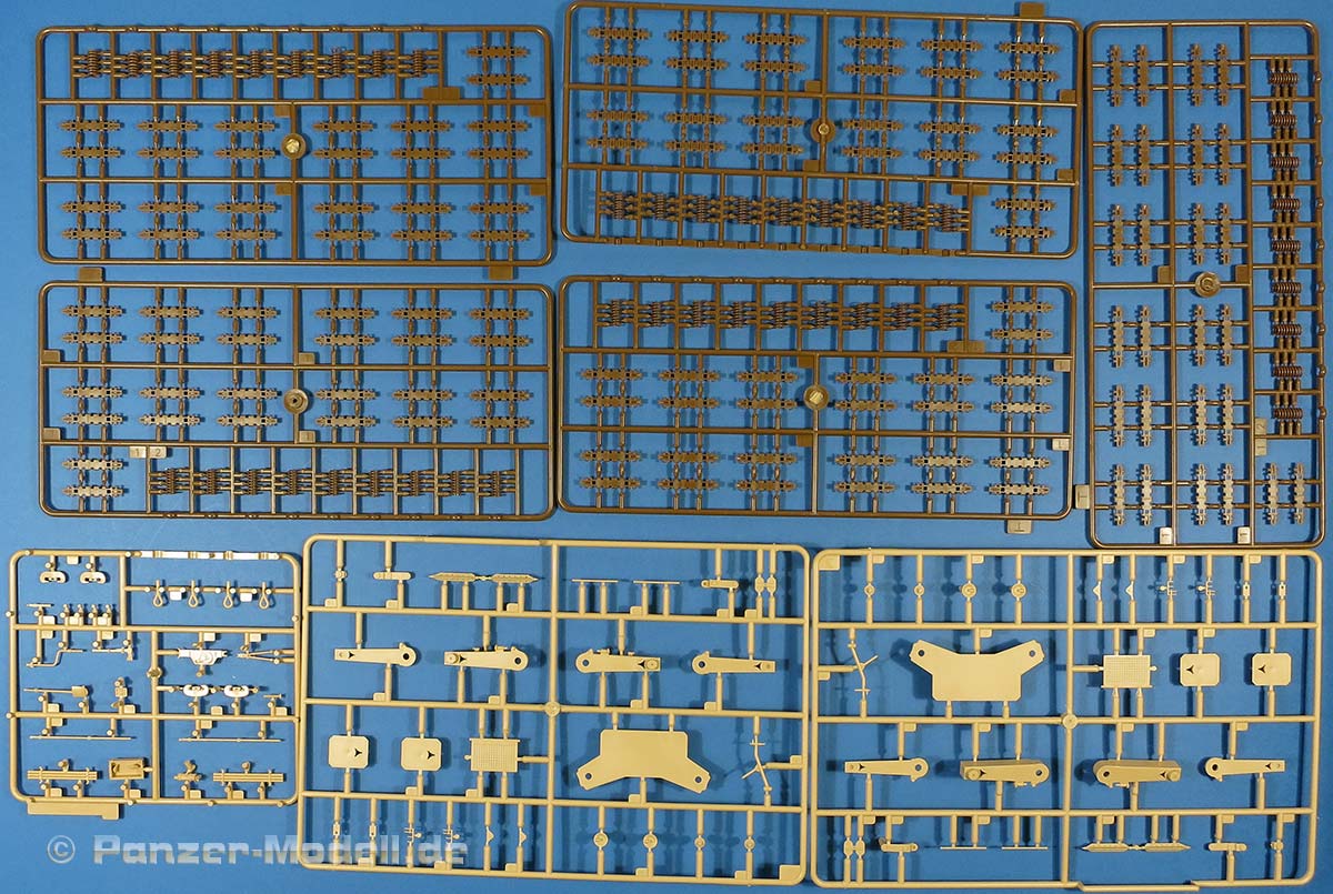 Im recht großen und randvoll gefüllten Karton finden wir 13 beige, 5 rotbraune Spritzlinge, eine Tüte Kettenglieder, ein Alu-Rohr (nur in der Erstauflage), die Unterwanne, die Oberwanne, eine kleine PE Platine und ein Decalbogen.