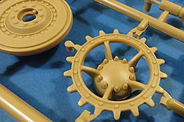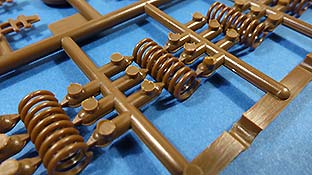 Die Unterwanne, die man bereits von den vorigen E-100 Bausätzen kennt, ist einteilig und macht einen guten Eindruck. Das Laufwerk baut sich aus angenehm wenigen Teilen zusammen - der Knüller ist allerdings die Beigabe von Spiralfedern aus Plastikspritzguss, die das Laufwerk beweglich machen, denn die Schwinarme werden ebenfalls nur eingesteckt und von innen beweglich gesichert. Zwar wird es etwas Arbeit machen, die Spiralfedern sauber aus dem Spritzling zu trennen und zu versäubern - aber eine bewegliche Federung damit für einen E-100 hat schon was!
