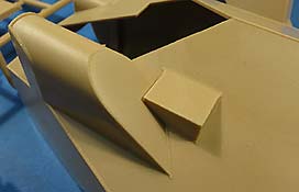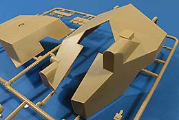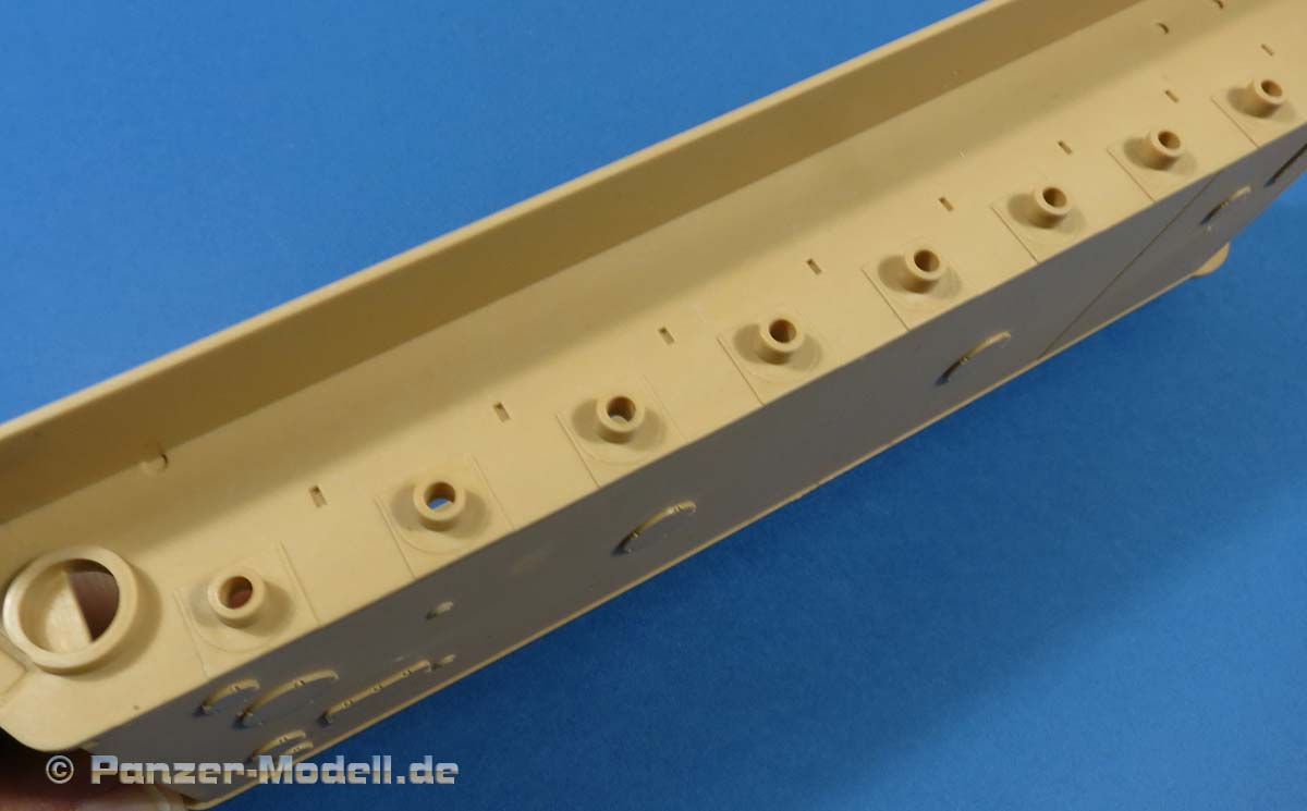 Dei Oberwanne ist komplett neu mit dem Motordeck mittig und der abgesetzten Plattform am Heck. Die Wannenseiten weisen im vorderen Bereich noch die Haltepunkte für die Seitenschürzen auf und die Schürzen liegen auch dem Bausatz bei, werden hier aber nicht benötigt.