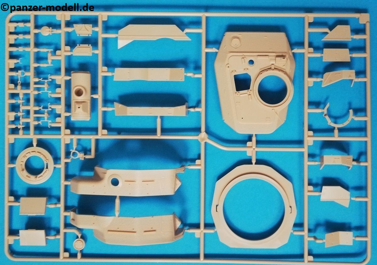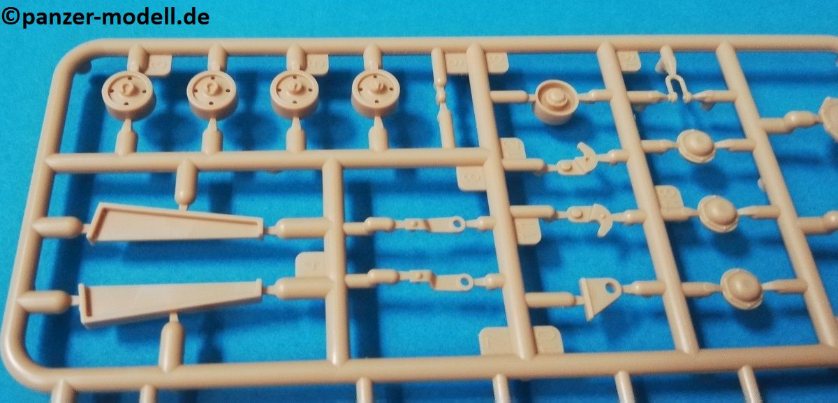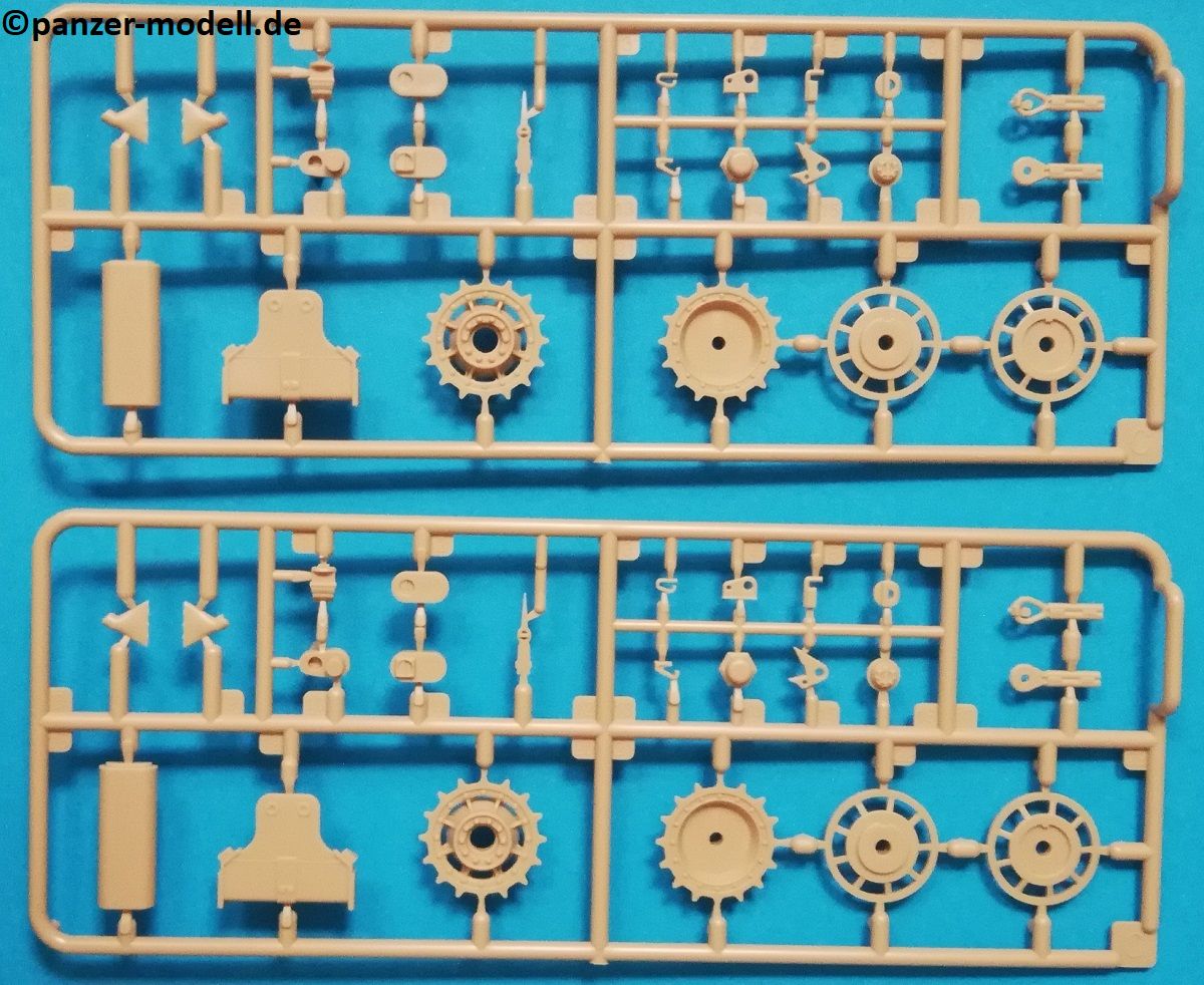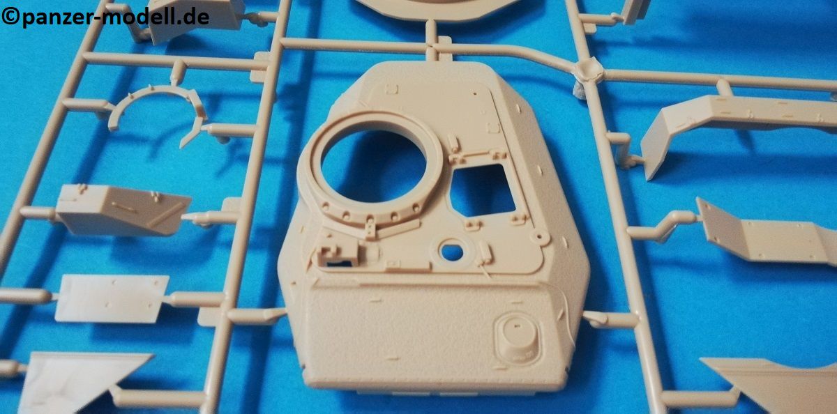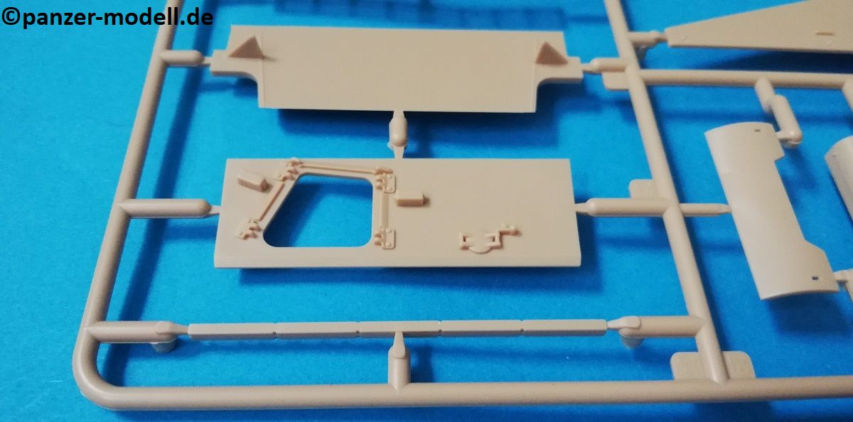 Die Detaillierung bewegt sich auf hohem Niveau. Einige der Details werden auch durch die beiliegenden, nicht optionalen Fotoätzteile, dargestellt - zum Beispiel die vorderen Halter der Kettenbleche. Die Unterwanne ist aus einem Stück gegossen und verspricht so eine stabile Grundlage. An der Wanne sind Klebepunkte für die Rollenwagen vorhanden, ansonsten findet man zwei gravierte Wartungsklappen an der Unterseite. Beim Fahrwerk werden an den Rollenwagen Metallfedern verwendet. Bei vorsichtigem Umgang mit Kleber bleiben diese beweglich, was sicher den Dioramenbauer erfreuen wird. Auch die Laufrollen sind sehr schön wiedergegeben und setzen sich erfreulicherweise aus nur drei Teilen zusammen, ohne hier an der Detaillierung zu sparen. Auch die Abdeckungen des Motorraumes sind sehr schön dargestellt mit deutlich weniger Teilen als bei AFV-Club, aber ähnlich detailreich.