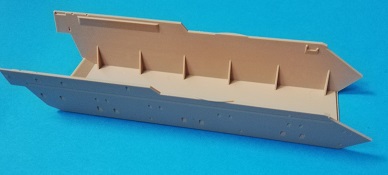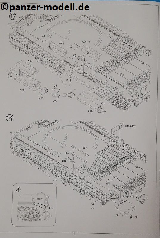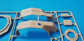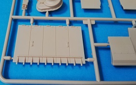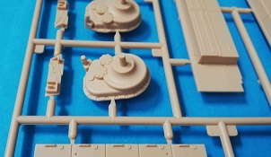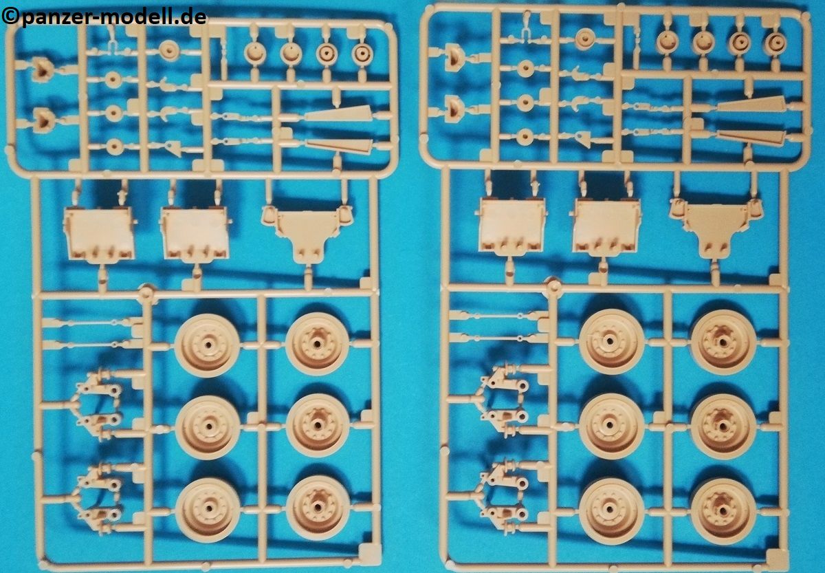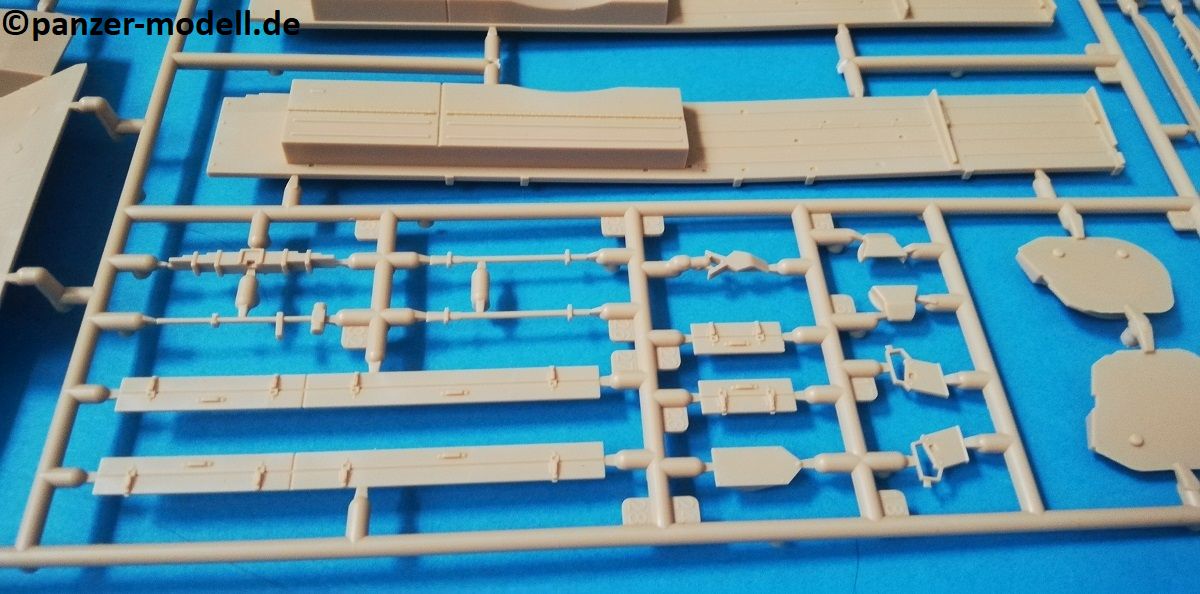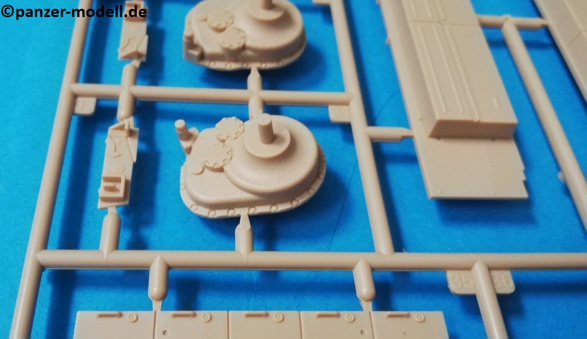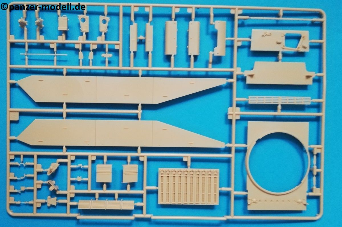 Die Detaillierung bewegt sich auf hohem Niveau. Einige der Details werden auch durch die beiliegenden, nicht optionalen Fotoätzteile, dargestellt - zum Beispiel die vorderen Halter der Kettenbleche. Die Unterwanne ist aus einem Stück gegossen und verspricht so eine stabile Grundlage. An der Wanne sind Klebepunkte für die Rollenwagen vorhanden, ansonsten findet man zwei gravierte Wartungsklappen an der Unterseite. Beim Fahrwerk werden an den Rollenwagen Metallfedern verwendet. Bei vorsichtigem Umgang mit Kleber bleiben diese beweglich, was sicher den Dioramenbauer erfreuen wird. Auch die Laufrollen sind sehr schön wiedergegeben und setzen sich erfreulicherweise aus nur drei Teilen zusammen, ohne hier an der Detaillierung zu sparen. Auch die Abdeckungen des Motorraumes sind sehr schön dargestellt mit deutlich weniger Teilen als bei AFV-Club, aber ähnlich detailreich.
