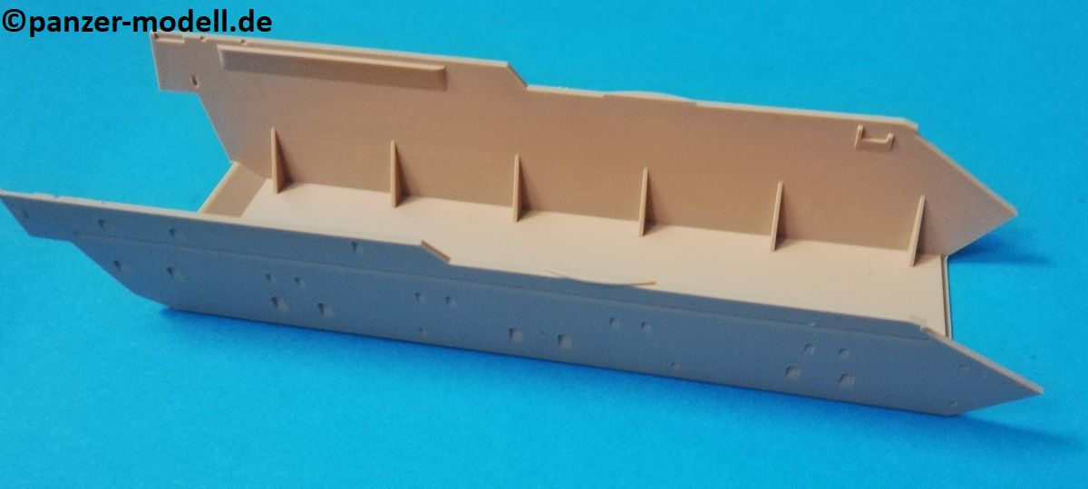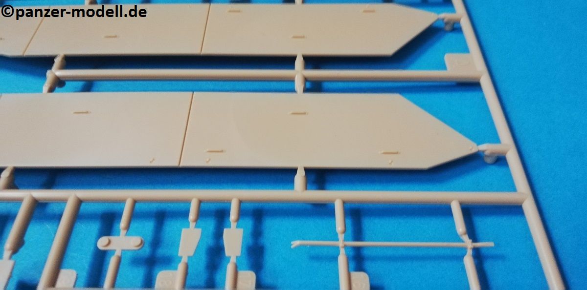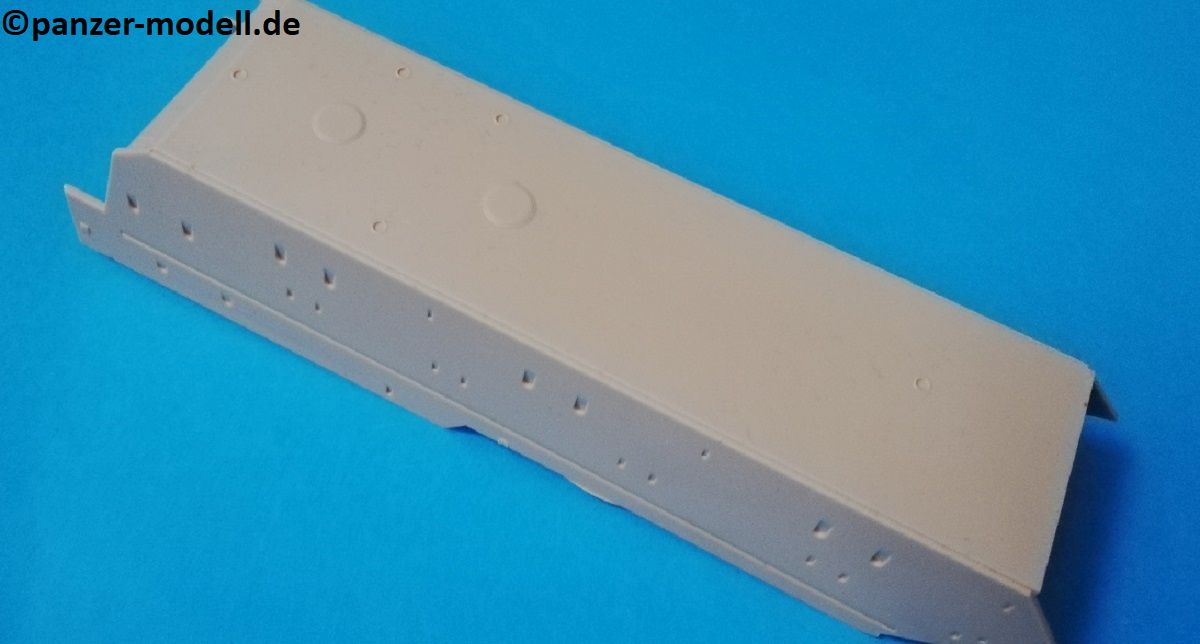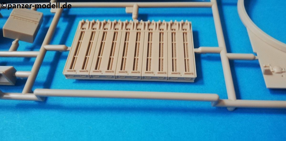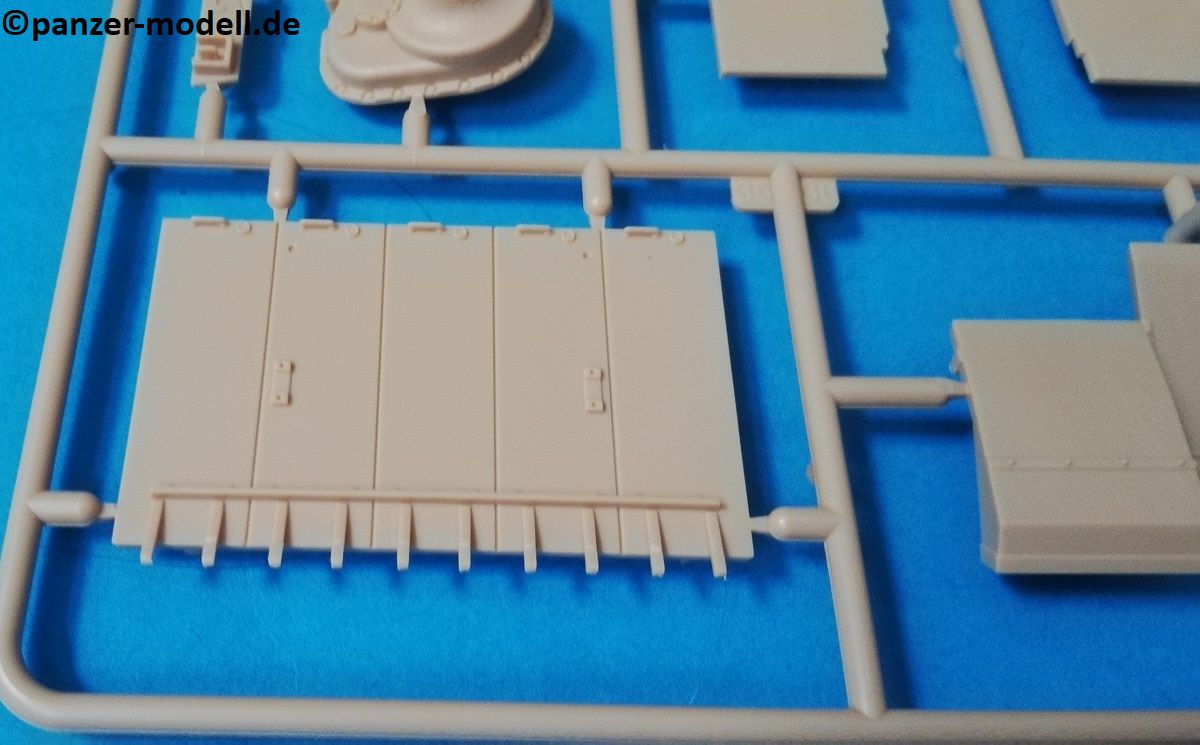 Die Seitenschürzen allerdings wirken etwas zu dick, in der Realität ist dies nur eine recht dünne Stahlplatte, hier wirken sie wie eine Zusatzpanzerung. Zudem sind diese nur einteilig dargestellt, was eventuell den ein oder anderen stören mag. Da hilft nur dünner schleifen oder durch Fotogeätzte Seitenschürzen ersetzen.