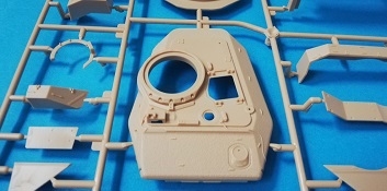 Positiv hervorzuheben ist das im Slide-Mould Verfahren gefertigte einteilige Kanonenrohr, welches bereits rund gespritzt ist. Felder und Züge sind hier allerdings nicht zu erkennen. Amusing Hobby hier die Chance verpasst hat, auch noch die späten 20-Pounder Rohre mit Rauchabsauger und eventuell das 105mm L7 Rohr beizulegen so wären schon einmal eine Menge Grundvarianten abgedeckt gewesen. Die Wasserdichte Plane an der Blende der Hauptbewaffnung fehlt leider ebenfalls. Da diese doch zwingend erforderlich ist, muss der Modellbauer hier zur Eigeninitiative schreiten, oder sich ein entsprechendes Teil im Aftermarket besorgen (z.B. DEF oder AFV-Club). Ansonsten besticht der Turm durch schöne Details, eine klasse dargestellte Gussstruktur des gegossenen Turmes und feinen Anbauteilen. Auch das .30 Cal Browning glänzt, wie das Rohr der Hauptbewaffnung mit einer offen gegossenen Mündung.