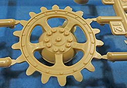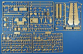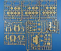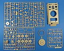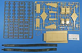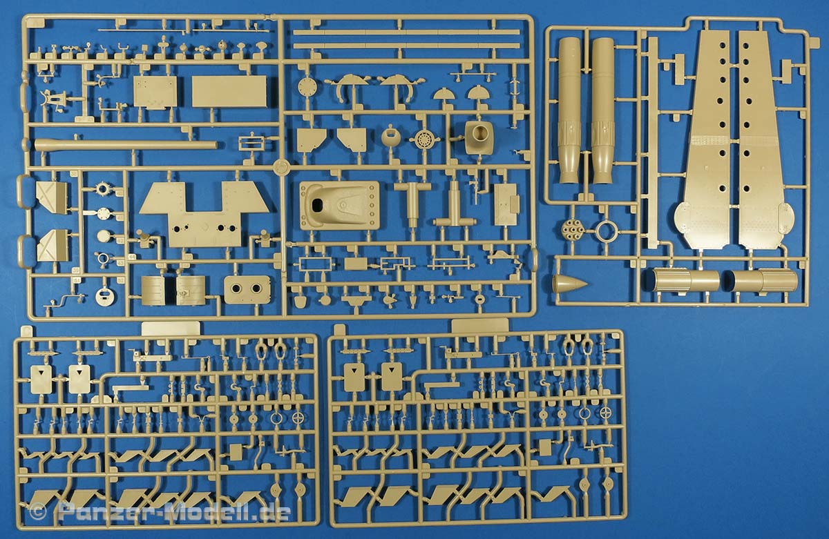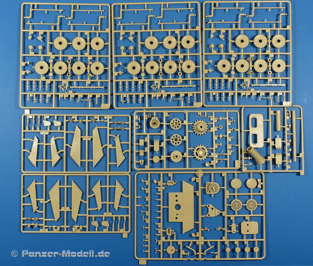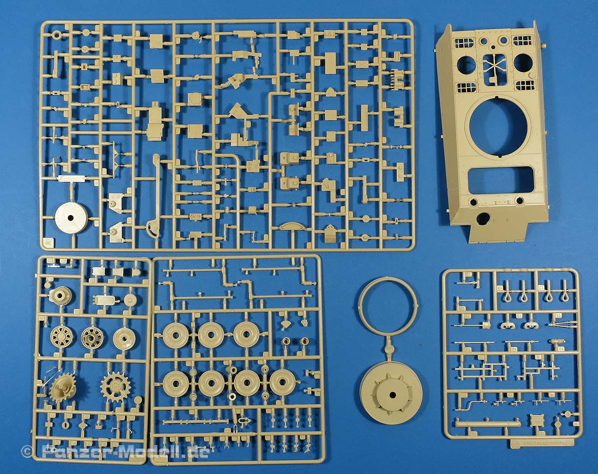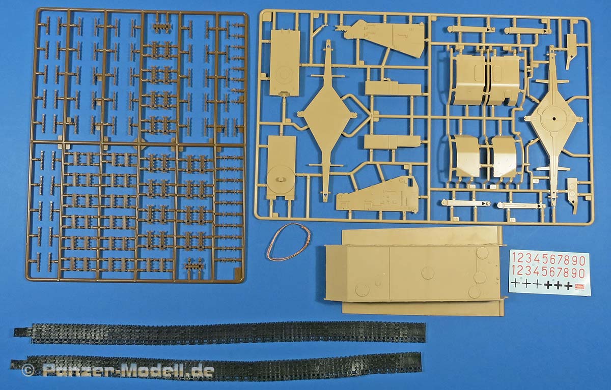 Im recht gut gefüllten Karton finden wir 17 beige, einen rotbraunen Spritzling, Oberwanne, Unterwanne, RIngabdeckung, zwei Vinylketten, eine kleine PE Platine, Kupferkabel und ein Decalbogen.