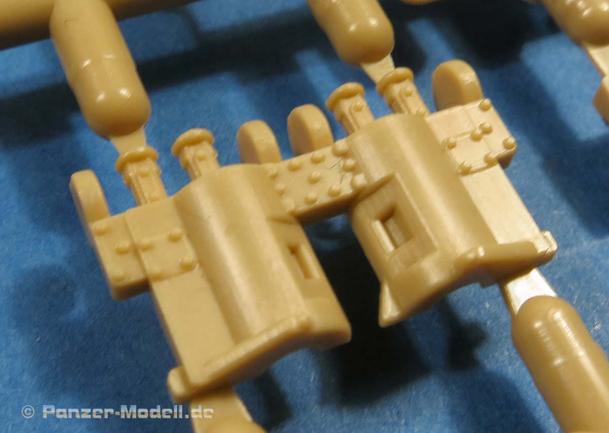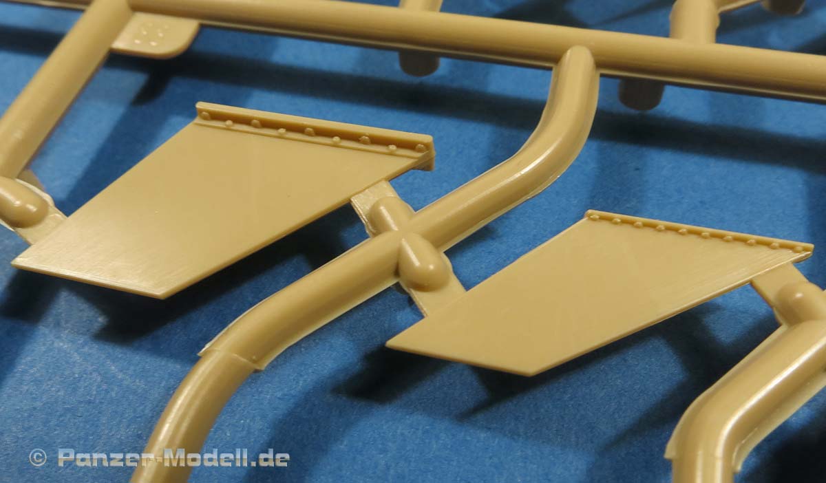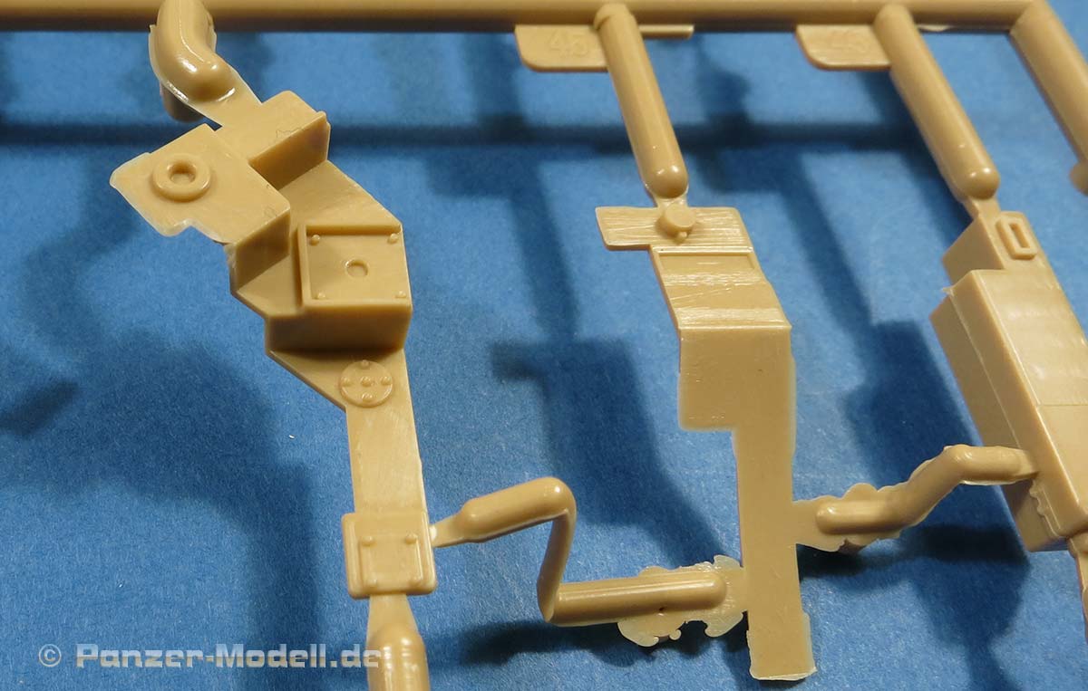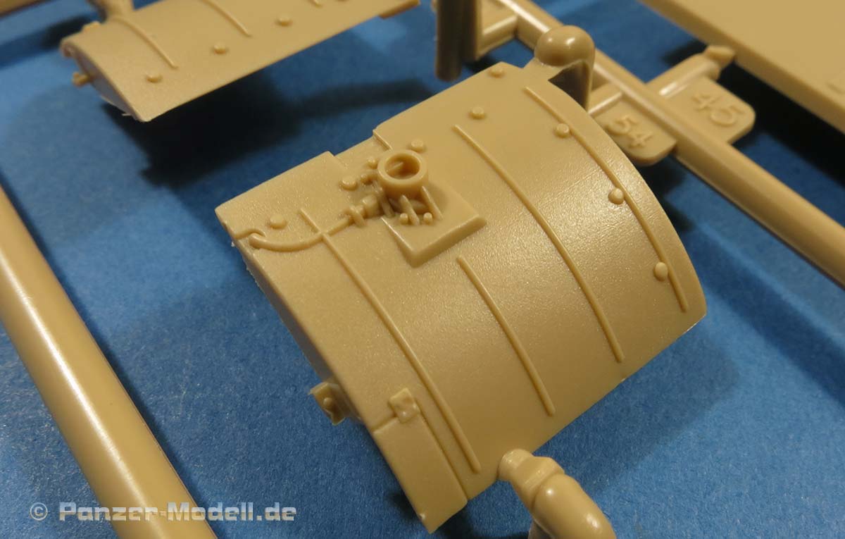 Die Schutzschilde an der Lafettenfront sind aus Spritzguss, welches naturgemäß etwas zu dick von der Stärke ist und als PE Teil sicher schöner gewesen wäre. Dennoch in der vorliegenden Form gut und vor allem mit den aufgeprägten Details sehr schön anzusehen.
