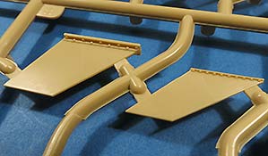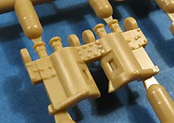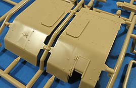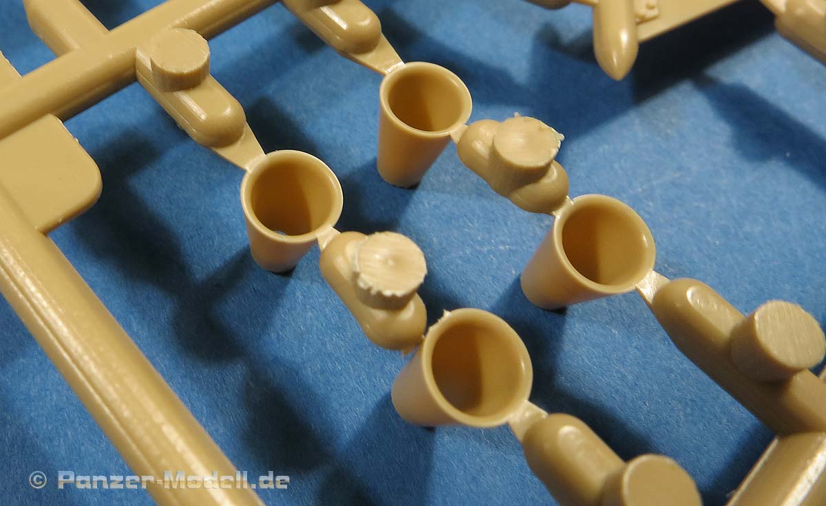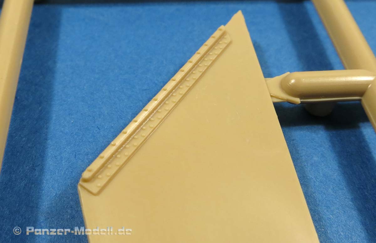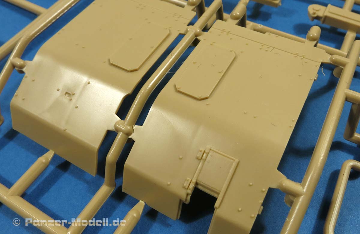 Die Schutzschilde an der Lafettenfront sind aus Spritzguss, welches naturgemäß etwas zu dick von der Stärke ist und als PE Teil sicher schöner gewesen wäre. Dennoch in der vorliegenden Form gut und vor allem mit den aufgeprägten Details sehr schön anzusehen.