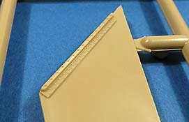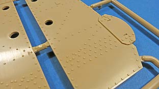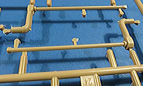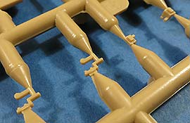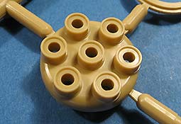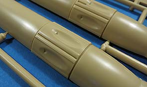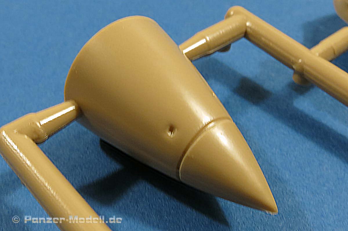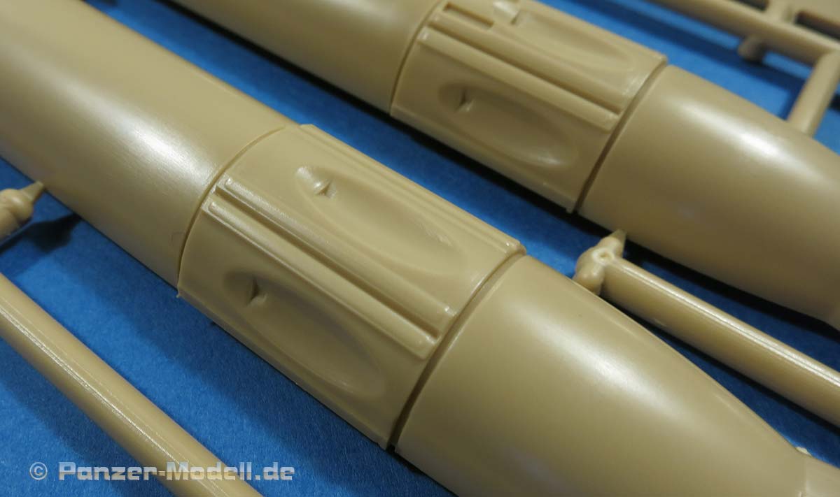 Die Rohrteile sind sauber und relativ unspektakulär - die Details zeigen sich an den Flügeln, an deren Basis sich Nietenbleche mit sehr vielen sehr feinen Nieten befinden. Am Mittelteil und natürlich an der Unterplatte werden die konischen Düsen einzeln eingeklebt - diese machen einen guten Eindruck und sind natürlich hohl gespritzt.